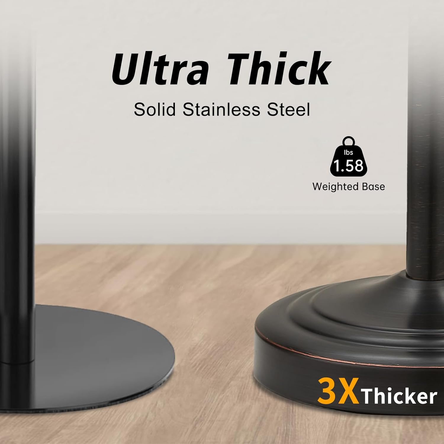 - ANTI-SCRATCH & ANTI-SLIP BASE-Round base of towel rack weighs 1.5 lbs. and is 5.5" in diameter, that can easily holds towel and won't fall over. There are circular padding with base to prevent the bathroom towel rack from moving out of place and keep your table free from scratches.
