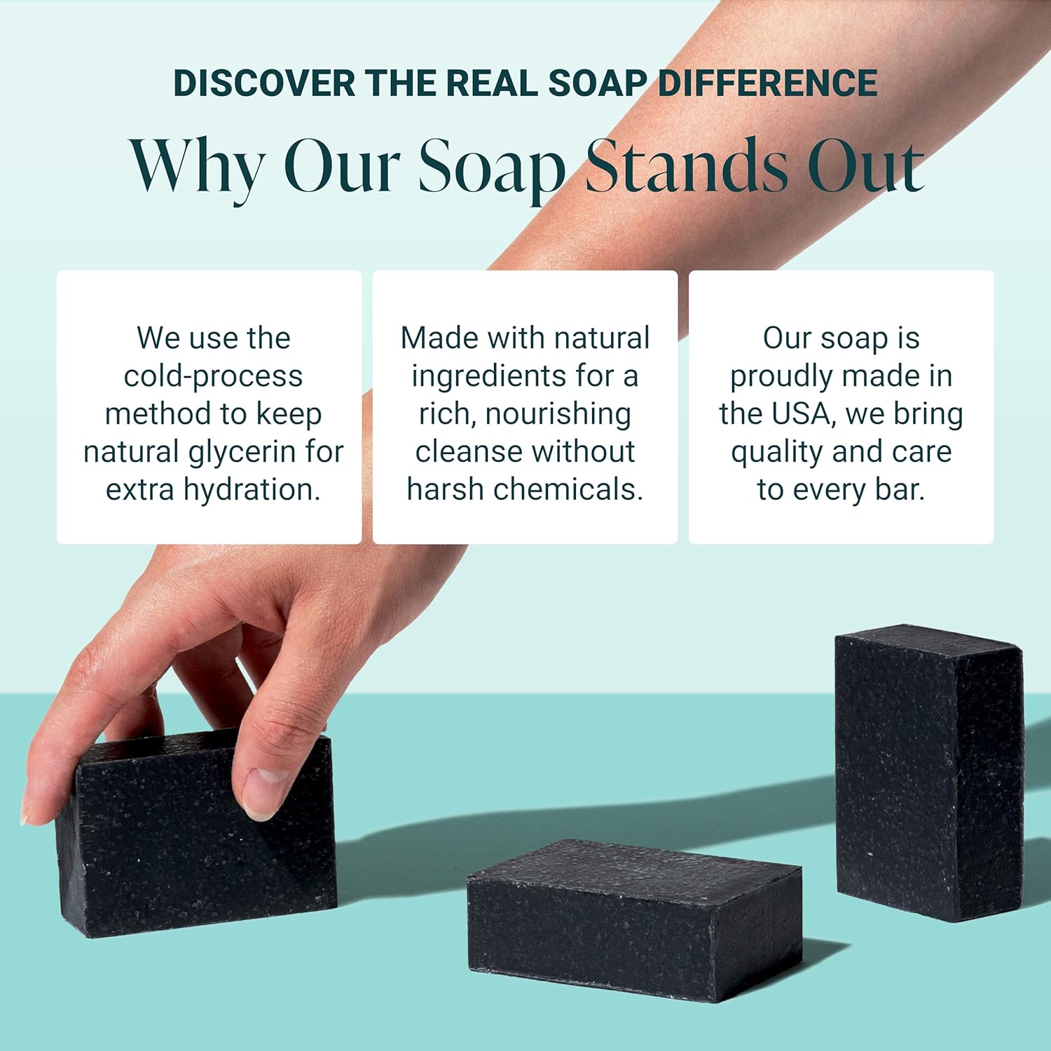 - THE COLD PROCESS DIFFERENCE: Traditional soap is made using the cold-process method, where fats and oils are used to create natural glycerin resulting in true soap (most commercial soaps on the shelves use synthetic ingredients that remove glycerin). The cold process allows all the natural soap goodness to stay intact and enhance our bars with their skin nourishing ingredients (Natural Glycerin, Raw Shea Butter, Natural Oils, Kaolin Clay)