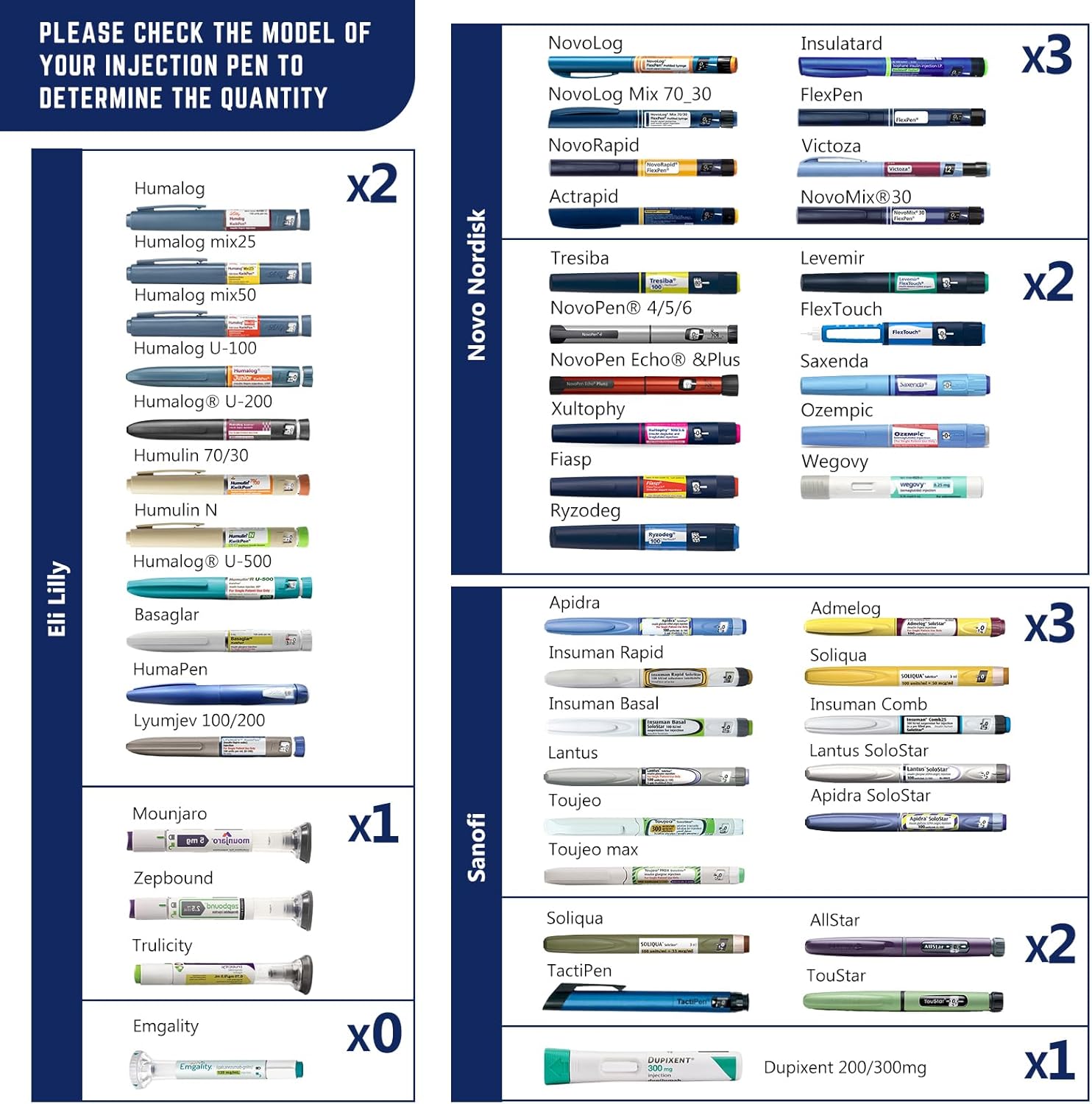 - How many injection pens can I put in: We have obtained the sizes of 95% of the common brands of injection pens on the market and made a detailed capacity reference chart. 1) You can refer to the table on our page to buy a suitable cooler. 2) If you can't find your injection pen model, please be sure to contact us and we will do our best to solve the problem for you