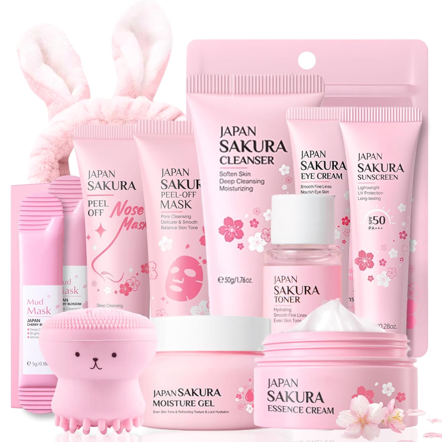 - SAKURA SKINCARE SET FOR WOMEN: This 11-piece beauty sakura skincare set for girls 10-12 hydratingincludes cleanser, toner, cream, sunscreen, serum, eye cream, nose mask, hydrating gel, mud mask, octopus cleanser and bunny headband . Make your skin care routine more complete with this spring gifts for women!