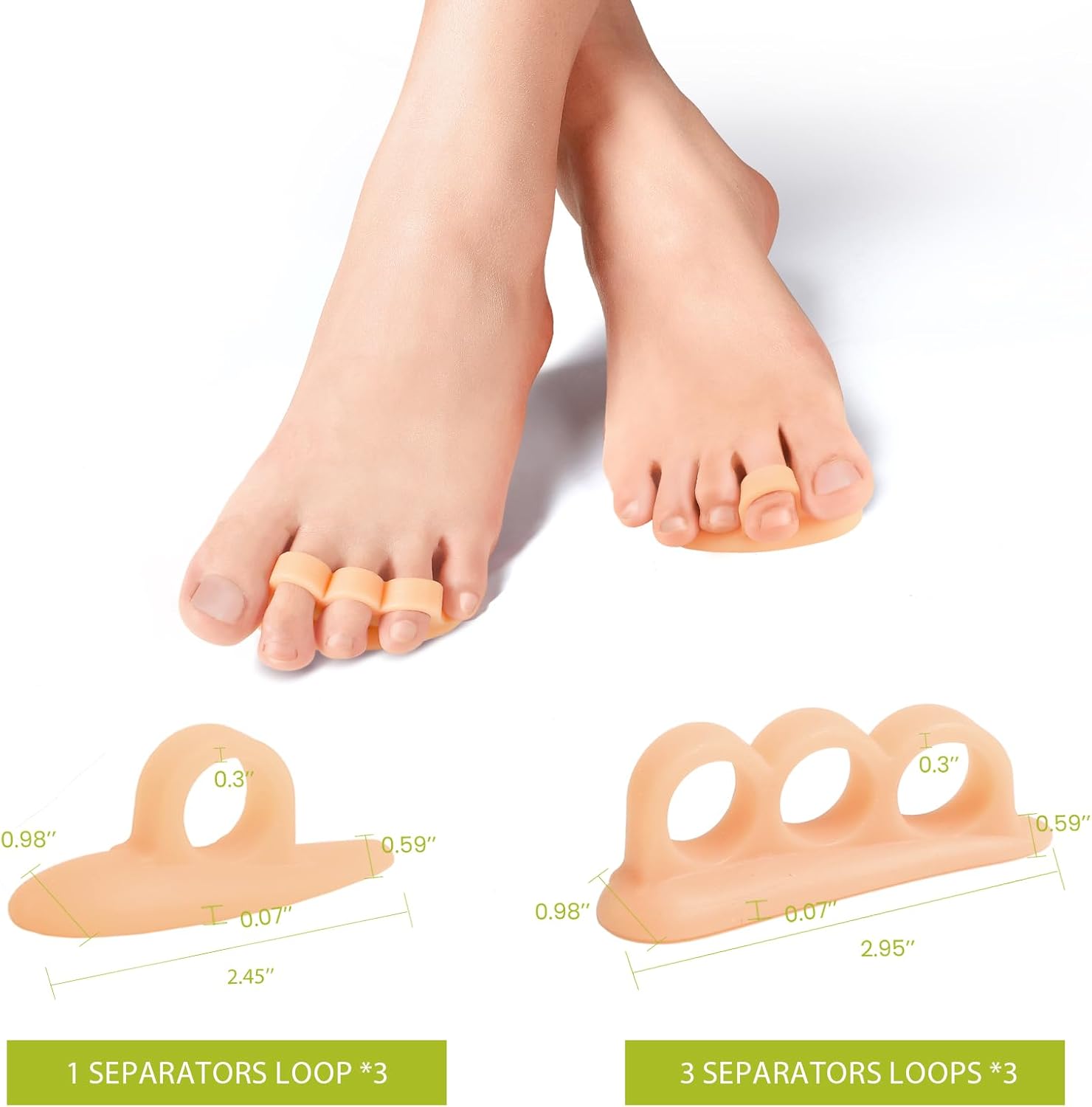 - Convenient Sizes - The hammer toe corrector set includes 3 pair soft single loop separators and 3 pair soft three loop separators that can be easily trimmed to fit perfectly on your toes.
