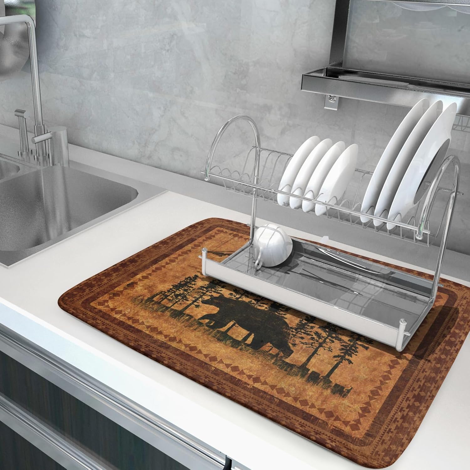 Forest Bear Dish Drying Mat 18x24 Inch Rustic Cabin Washable Microfiber Absorbent Dishes Drainer Rack Pad for Kitchen Counter Home Decor