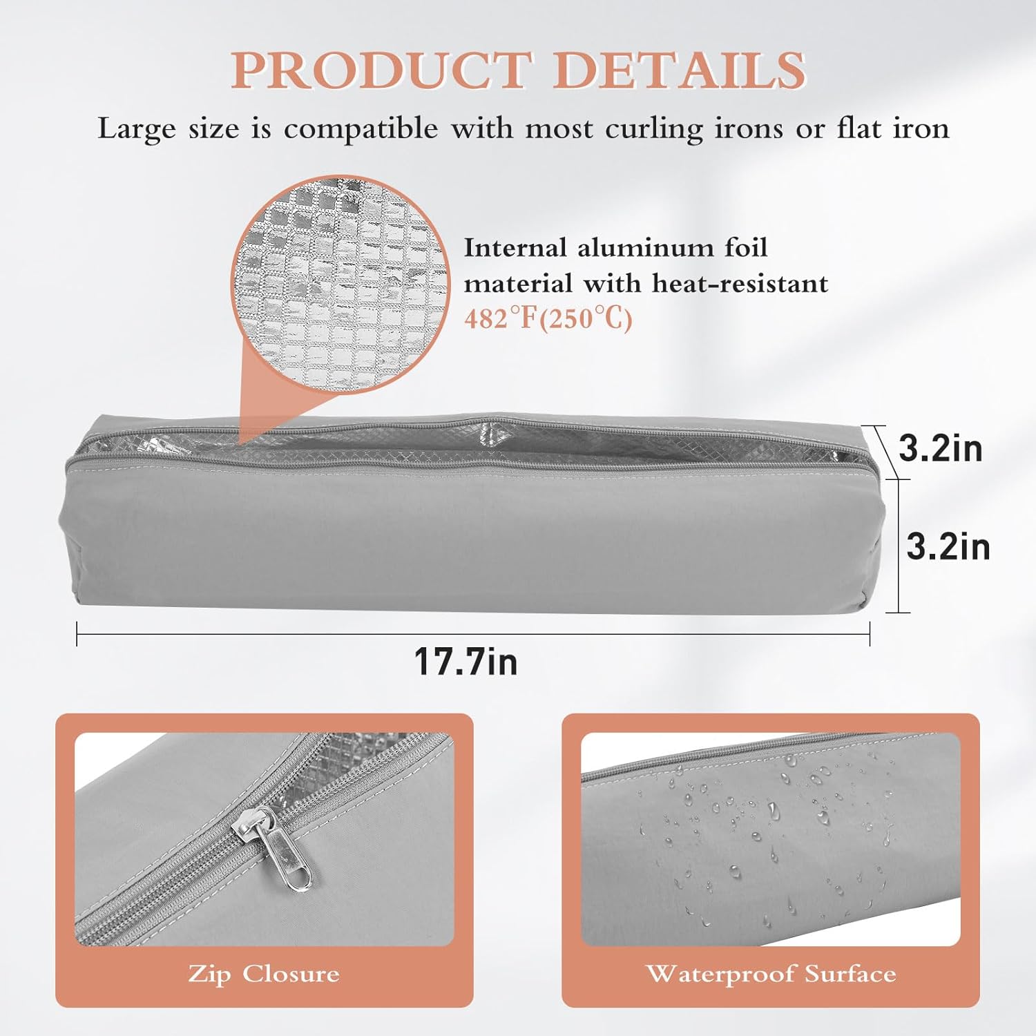 - EXCELLENT DESIGN: This curling iron holder bag is designed with 17.7 x 3.2 x 3.2 inches, and can accommodate most hair styling tools; It weighs 0.18 lb only and will not place an extra burden when you travel; The inner lining of our flat iron travel case is made of special aluminum foil material which can be cleaned by gently wiping it with a cleaning cloth