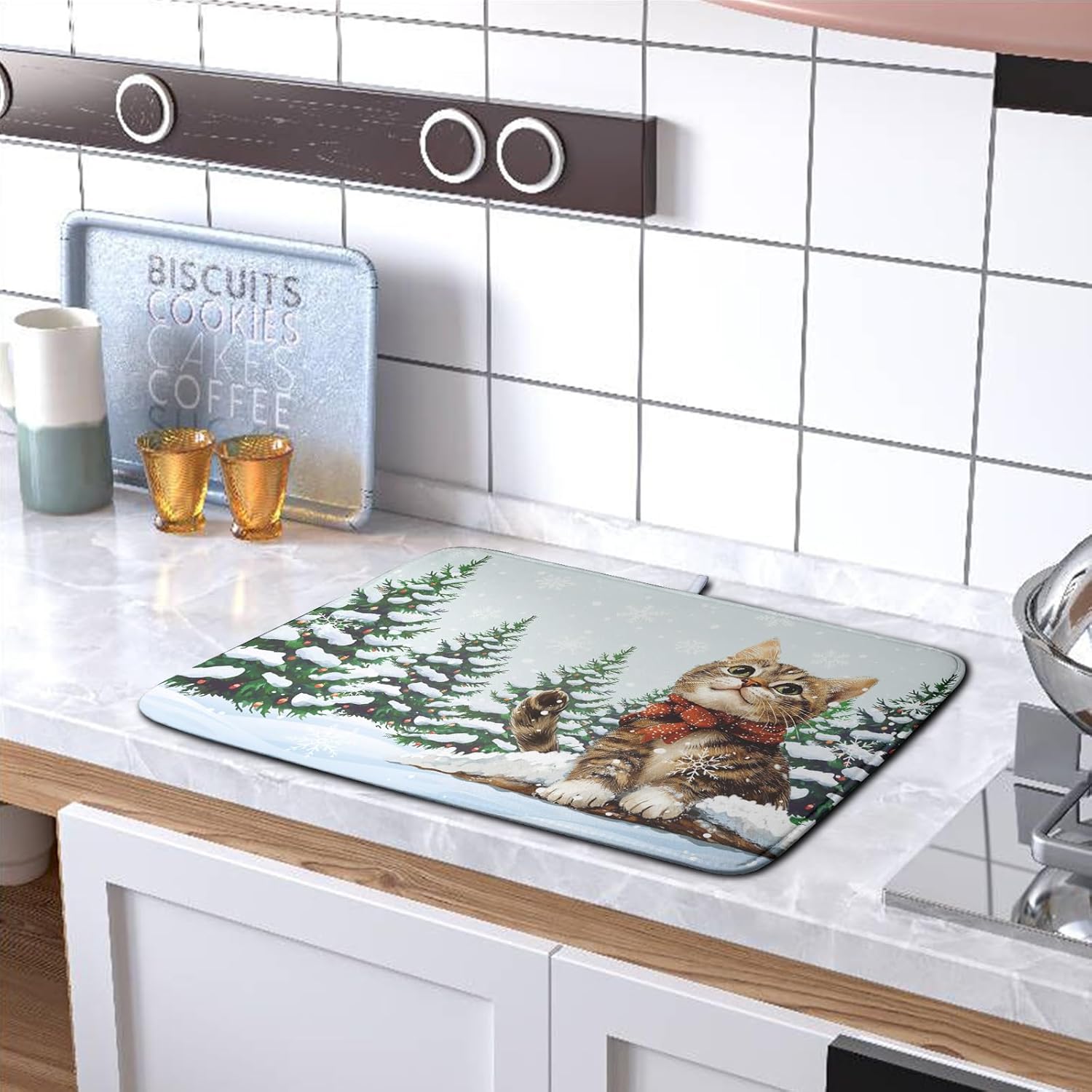 Winter Cat Dish Drying Mat for Kitchen Counter 18x24 Inch Cute Kitty Snow Pine Tree Dishes Drying Mats Large Microfiber Absorbent Dish Rack Pad Fast Dry Dish Mat for Coffee Bar Sinks Home Accessories