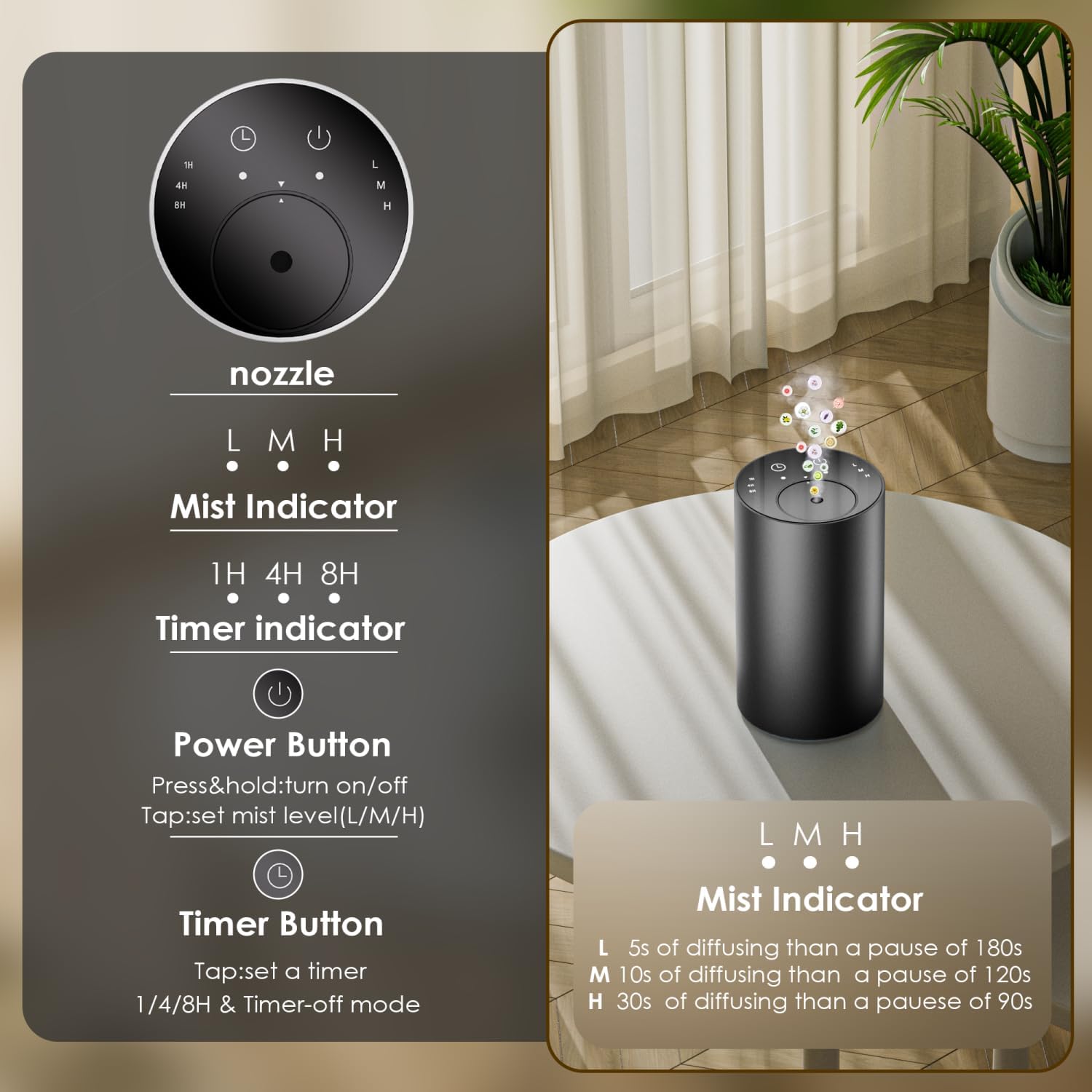 Waterless Essential Oil Diffuser, Portable Aromatherapy Diffuser, Mini Scent Machine, Battery Operated, 1/4/8-Hour Timer, 20ml Capacity, 3 Mist Levels for Home, Car, Room Office,No included oil(Black)