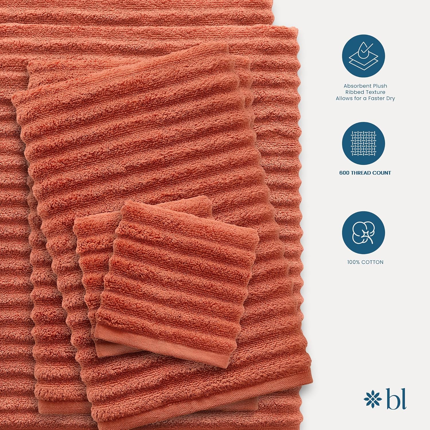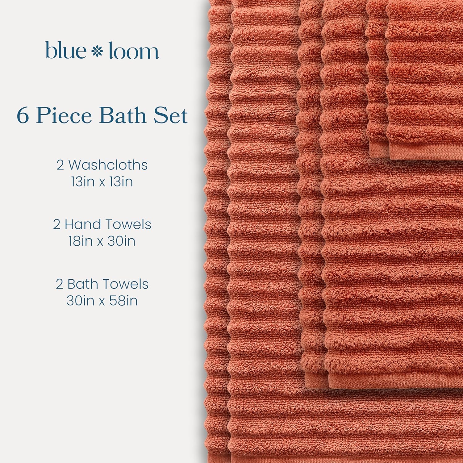 Blue Loom Ribbed Bath Towels Set, 100% Cotton 600GSM, Soft Absorbent Durable 2 Bath Towels, 2 Hand Towels, 2 Wash Cloths for Bathroom - Mason (58" x 30" inch Towels) (Terracotta, 6 Piece)