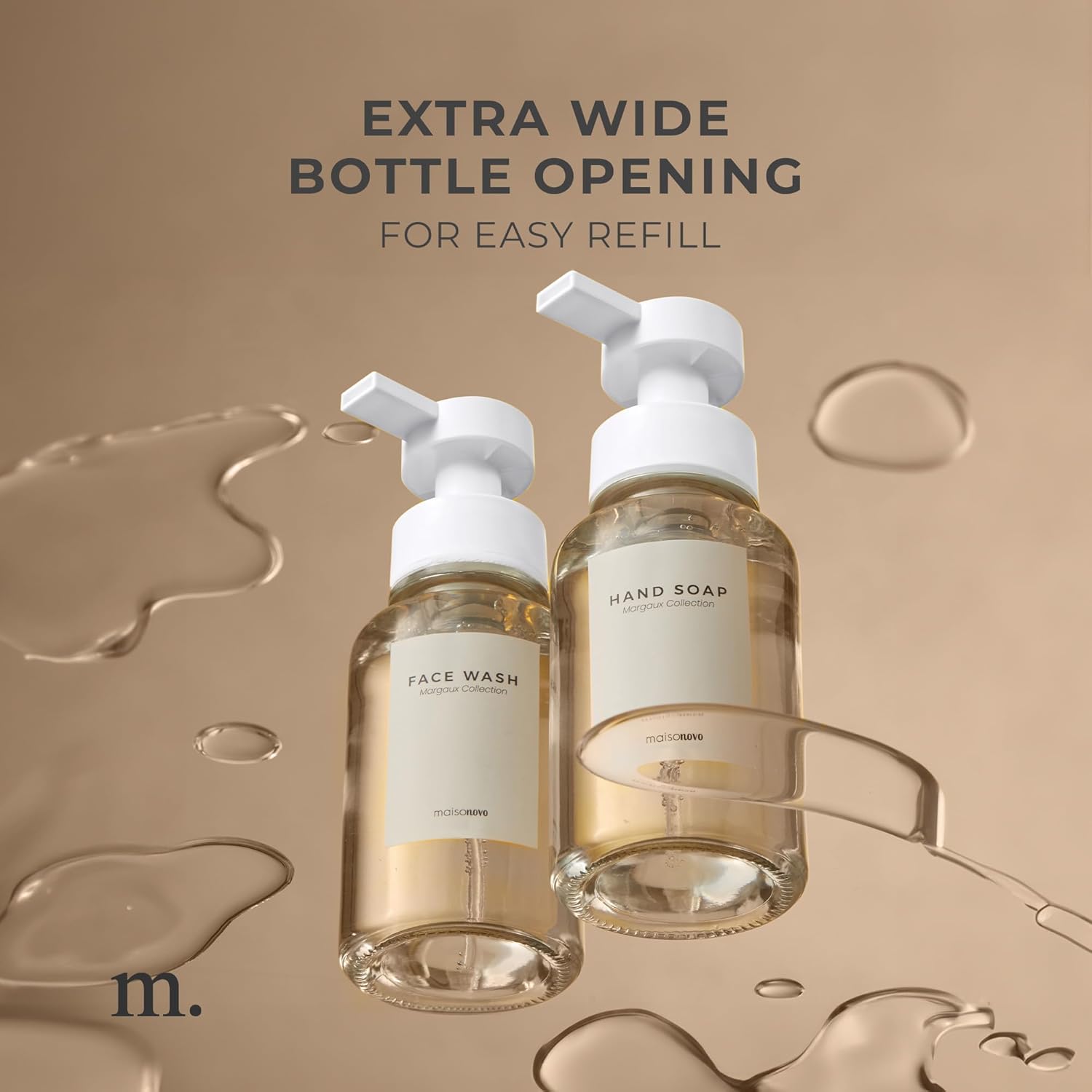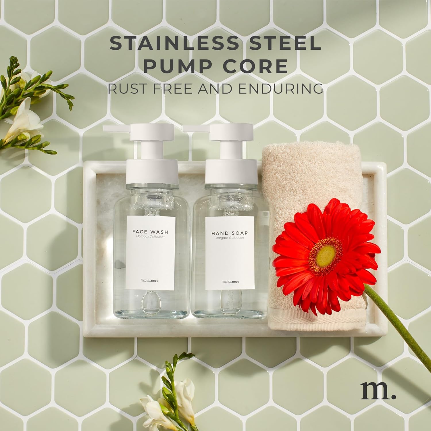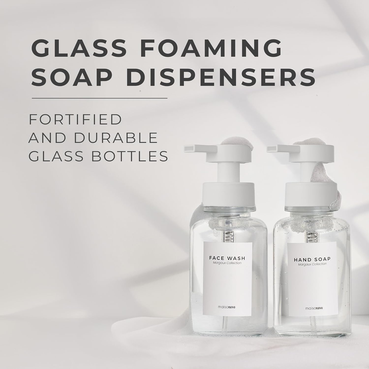 - This Set Includes: The MaisoNovo glass foam pump bottle set includes: two (2) 14oz foaming dispensers, and four (4) waterproof face wash and hand soap labels.