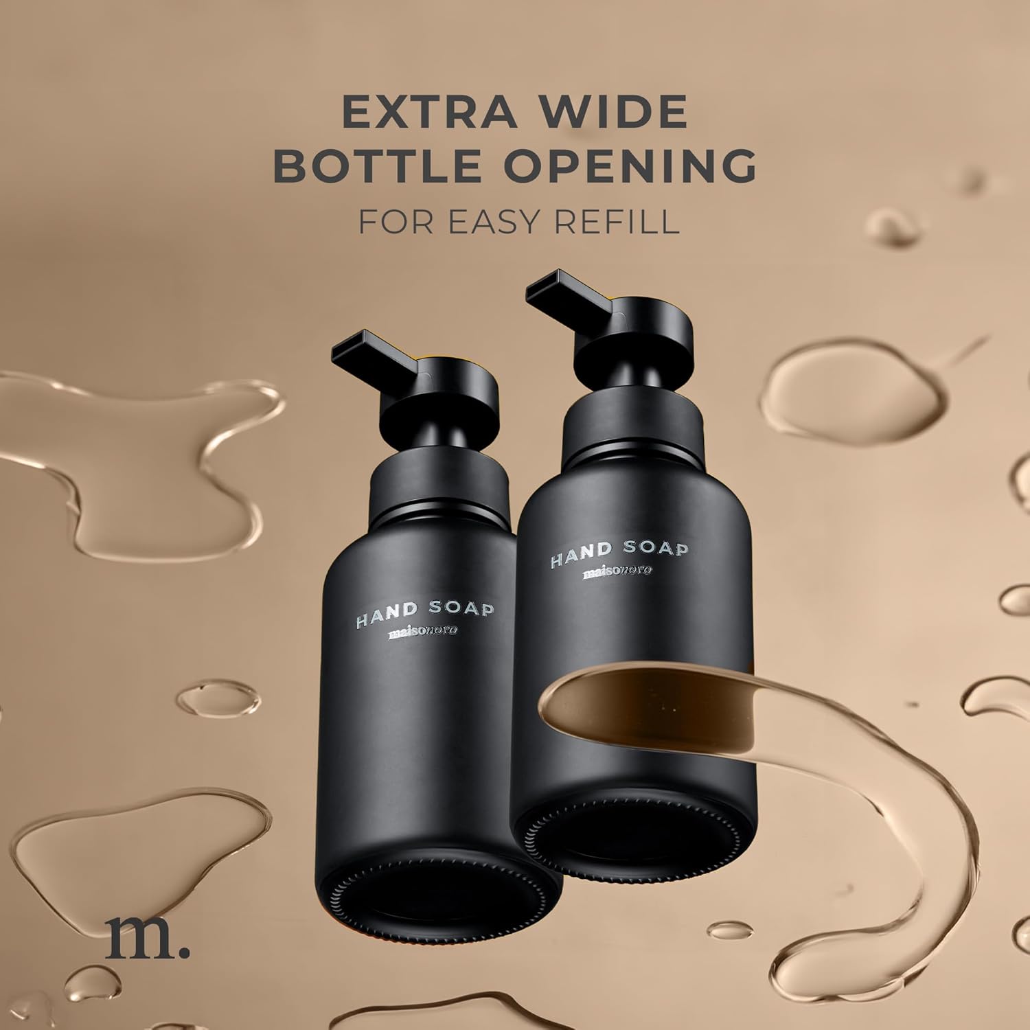 - This Set Includes: The MaisoNovo glass foam pump bottle set includes: two (2) 14oz foaming dispensers, one (1) hand-made concrete tray, and four (4) waterproof face wash and hand soap labels.