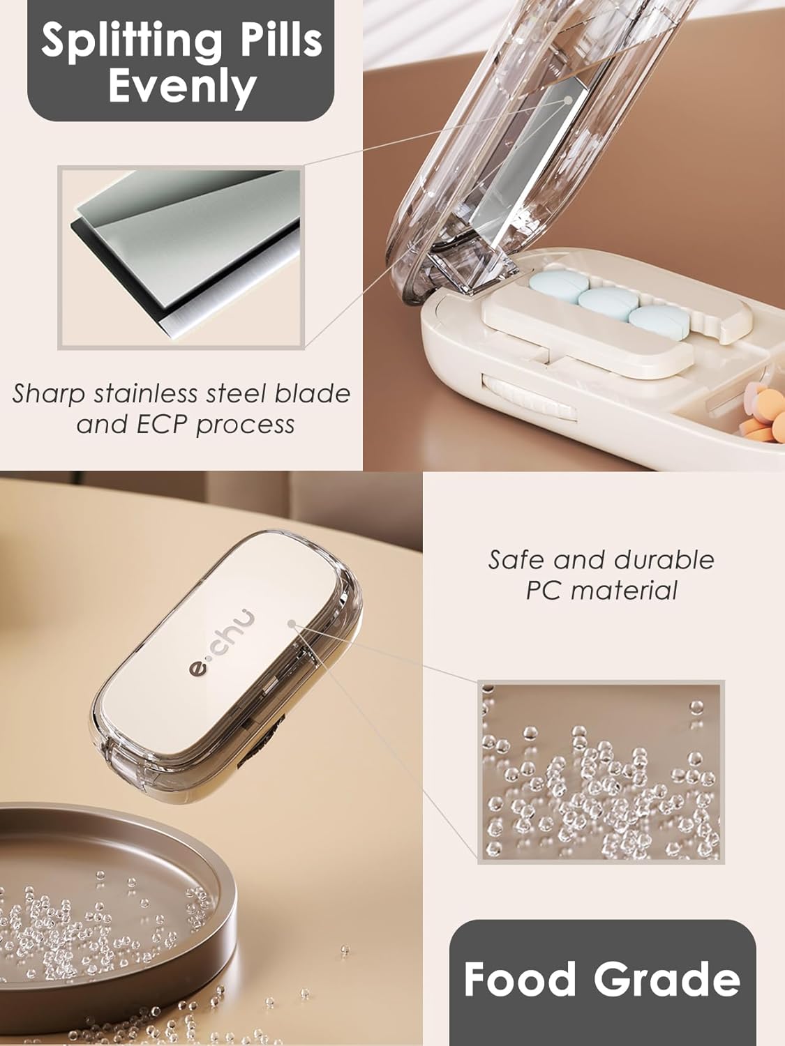 - Safe and Sturdy: The steel blade is sharp and easily splits small or large pills and tablets; its PP quality and stylish appearance stand up to repeated use