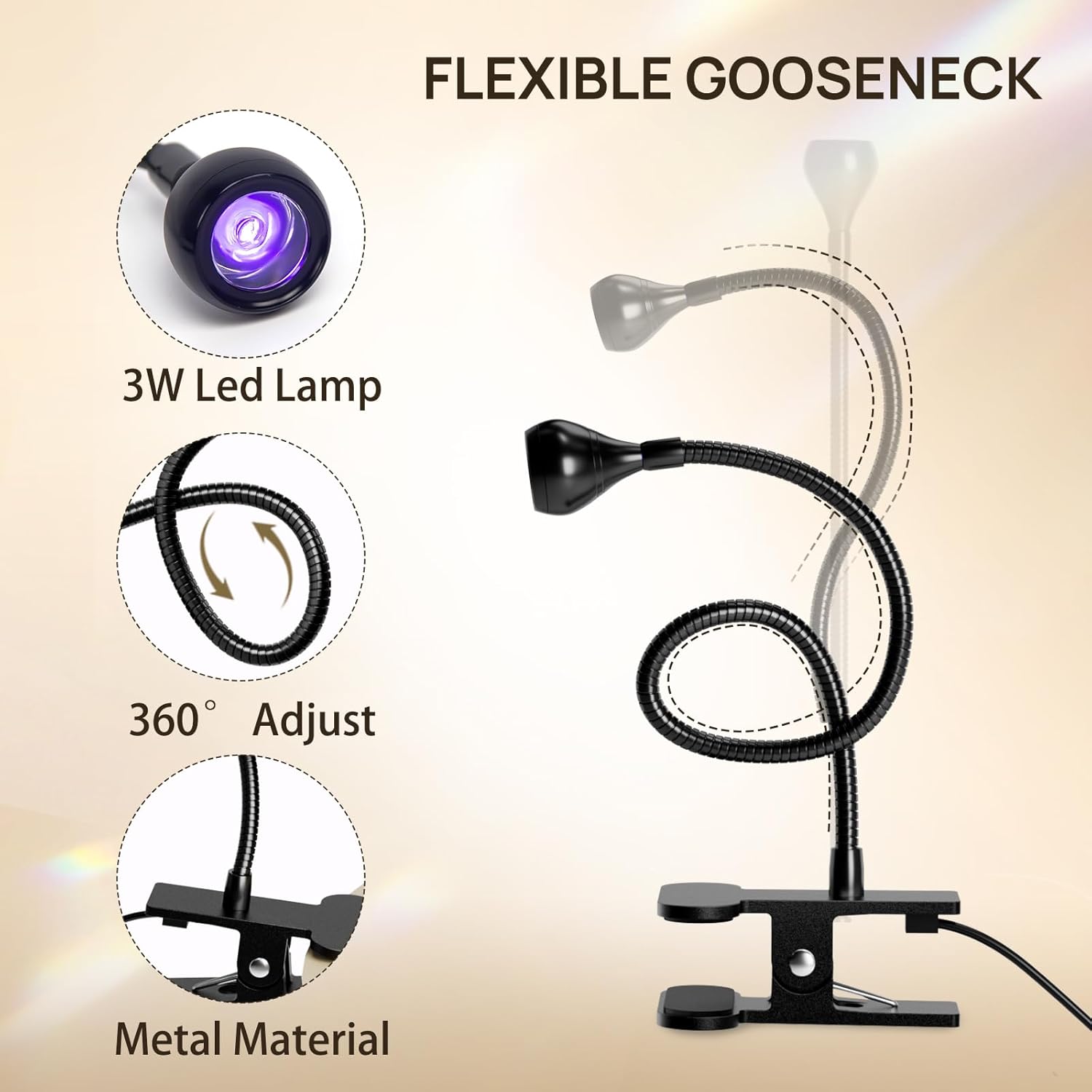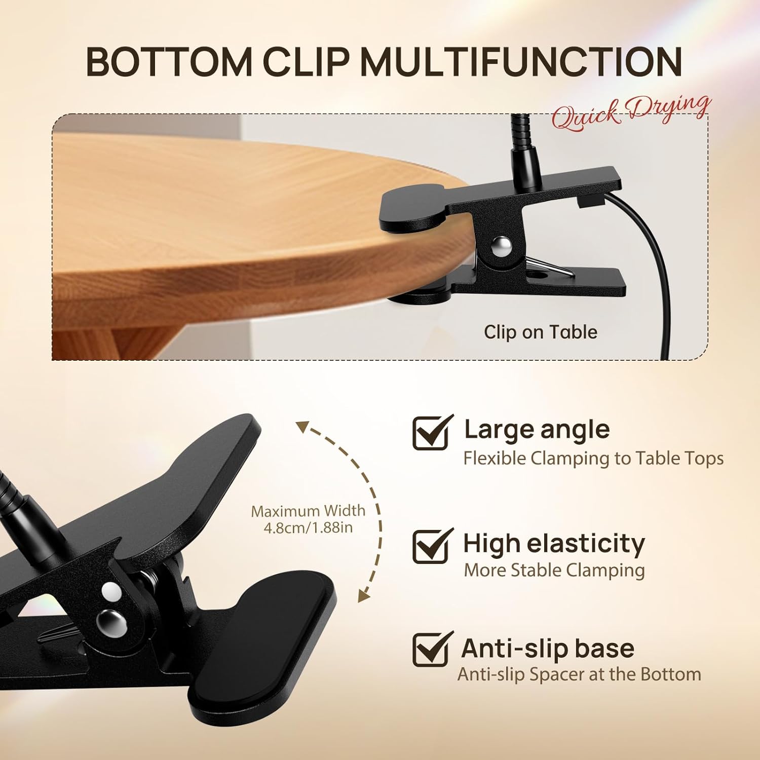 - FLEXIBLE NAIL LIGHT-The gooseneck of the LED nail lamp can be adjusted and bent 360 degrees at will, allowing for flexible adjustment of the height and direction of uv nail light cure, ensuring that there are no blind spots shining on the glue. Your hands can be easily placed in a comfortable position. The clip base at the bottom of the nail dryer can be clamped onto table and bed boards up to 1.2 in away, ensuring smooth and stable.