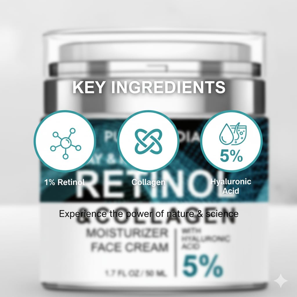 Retinol Cream for Face Anti-Aging Moisturizer with Collagen for Deep Wrinkles, Ideal for Women & Men - Day & Night Anti-Aging Skin Care with Hyaluronic Acid 5% 1.85 Fl Oz