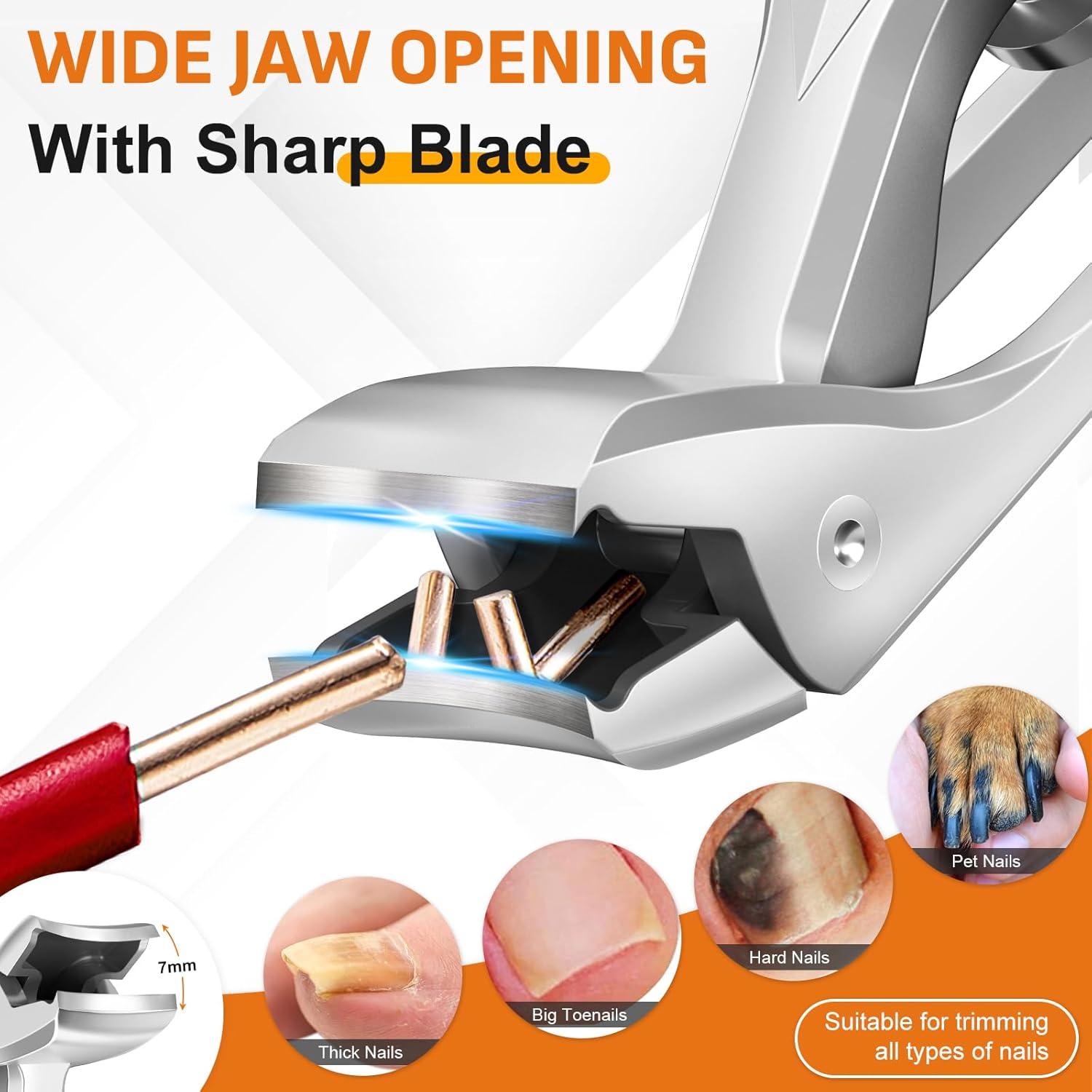 - WIDE JAW TOENAIL CLIPPERS FOR THICK NAILS - Our thick toenail clippers with wide jaw curved blades which can open up to 7mm, taking on the thickest, most stubborn nails with ease. Works great especially at hard nails for men, elderly, or pets