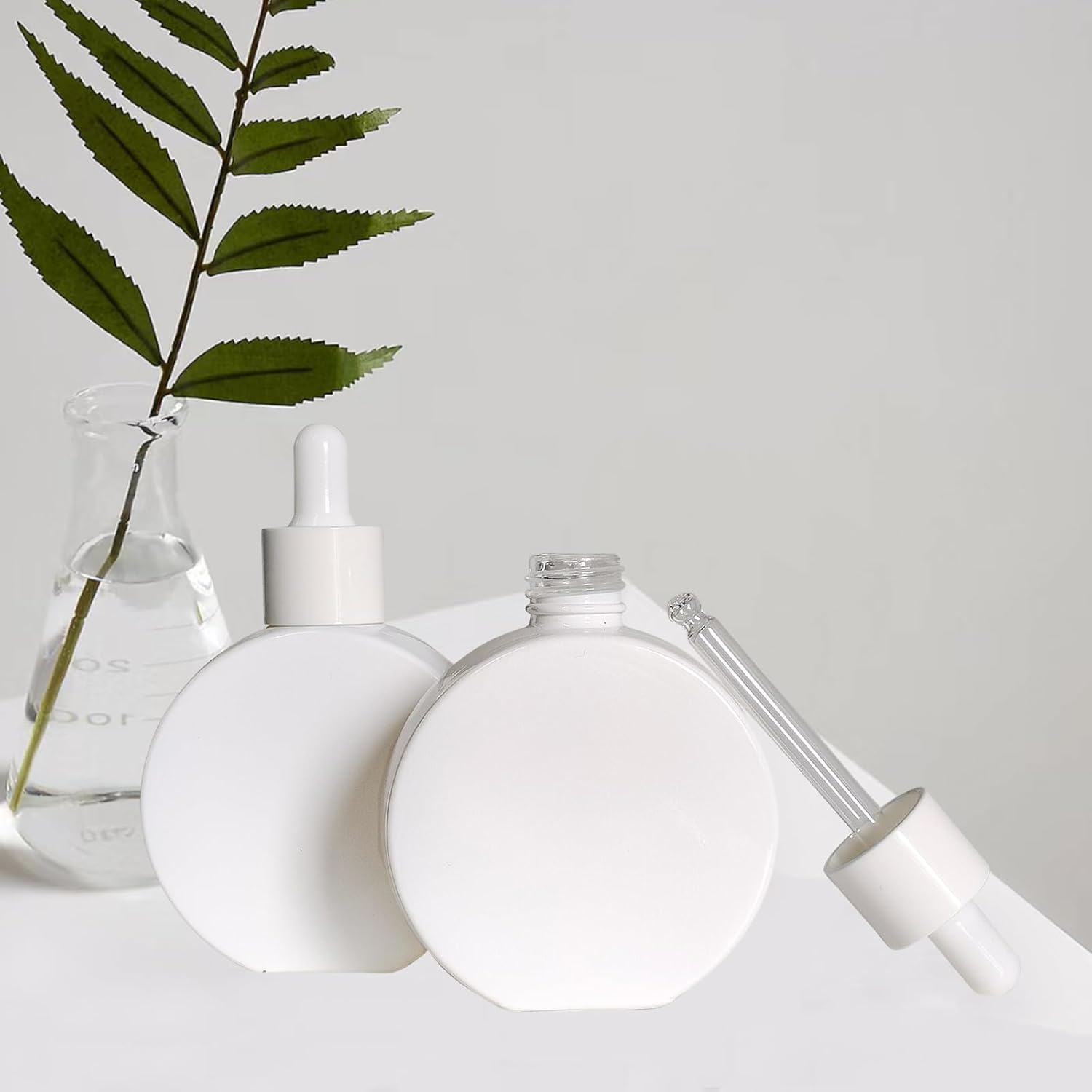 - Package Includes:6 White coated glass flat round bottles, glass droppers, and white caps set, with 2 funnels, 2 pipettes, and 6pcs labels to that will allow you to effectively organize and store all your essential.