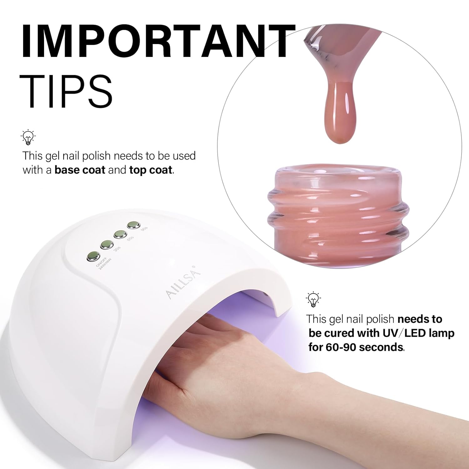 - Jelly Feeling Nude Gel Nail Polish: AILLSA nude gel polish has a semi-transparent color, you can adjust the depth of the color according to your preference, the more layers you apply the deeper the color becomes and goes from sheer to opaque. *The color of the gel nail polish will also vary slightly depending on the of the nail bed color.