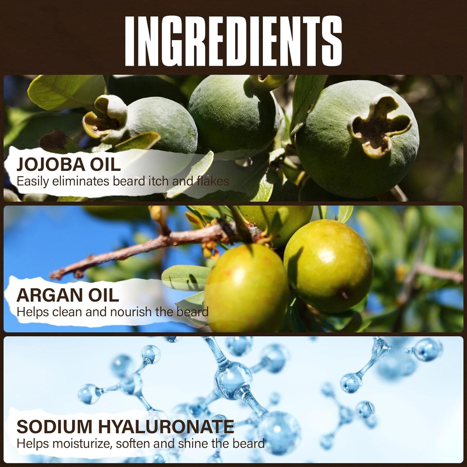 - TAMING YOUR BEARD: Argan oil, jojoba oil and sodium hyaluronate deeply cleanse and nourish your beard. The blend of moisturizing formulas minimizes irritation while helping to tame your coarse, hard, dry beard, leaving you with a soft, smooth beard that won't feel heavy or greasy. Easy to style.