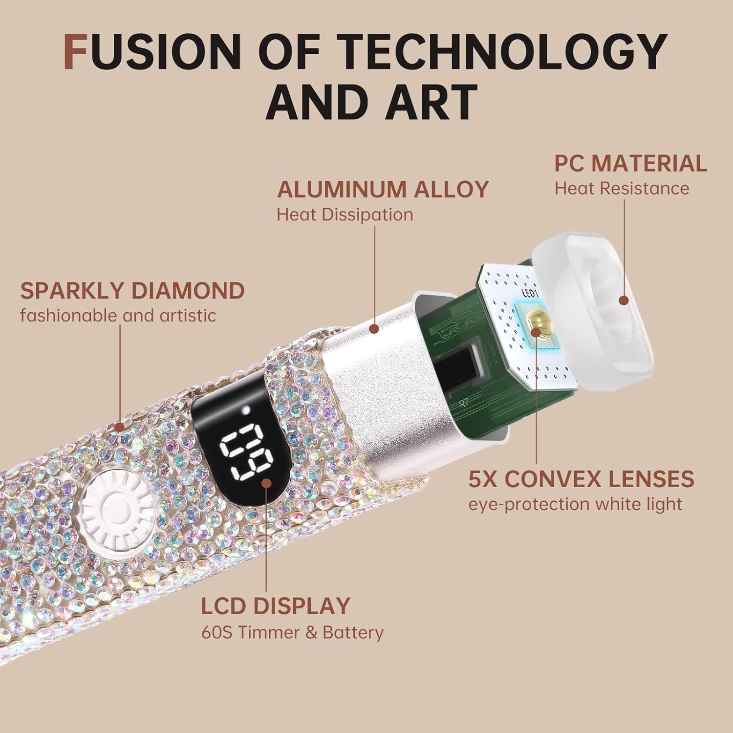 - 【Diamond Surface and 5X fast Curing】This uv nail light adopts an eye-catching shiny and fashionable diamond surface design.Equipped with high-quality lamp beads emitting 365 + 405nm and convex lens to achieve 5 times amplified spotlight, suitable for most gel nails and reduces curing time and ensures evenly curing from multiple angles