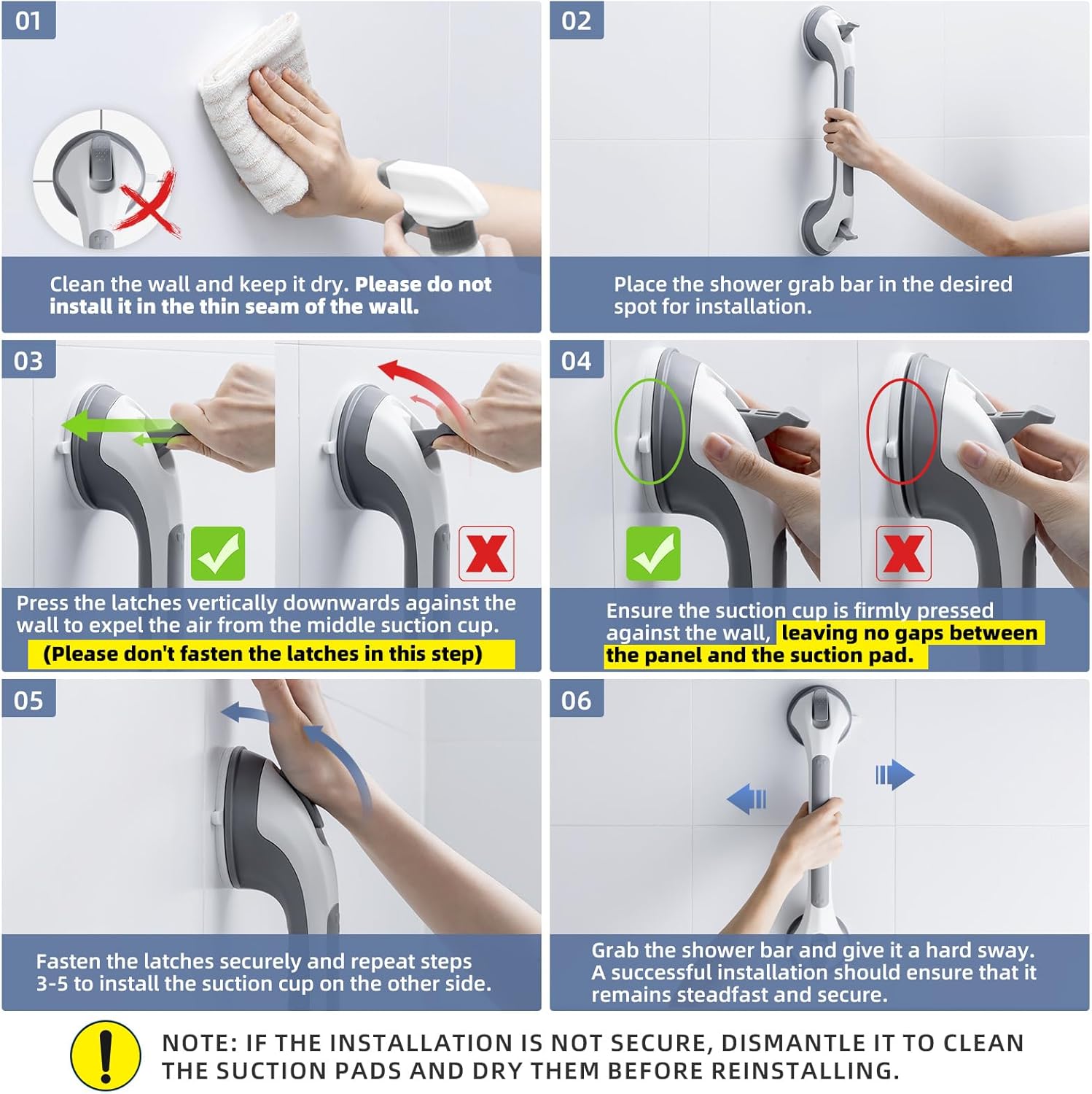 - No Drilling & Easy Installation and Remove: The grab bars only takes 5 seconds to install, even the elderly can easily complete the installation.With no drilling and no hardware,you can install this grip shower handle on your bathroom easily. The safety handles can be removed without damage to the wall. The shower bars for elderly suction can be used repeatedly after dismantling and washing