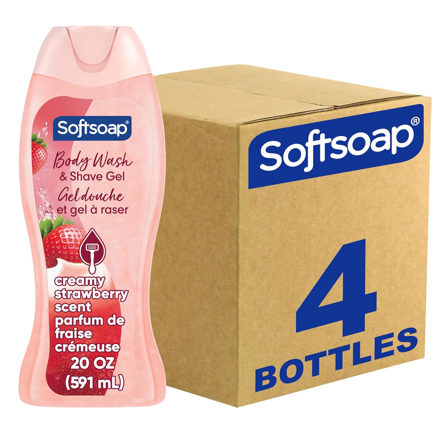 - Four (4) 20 fl oz bottles of Softsoap Moisturizing Body Wash and Shave Gel, Creamy Strawberry Scent