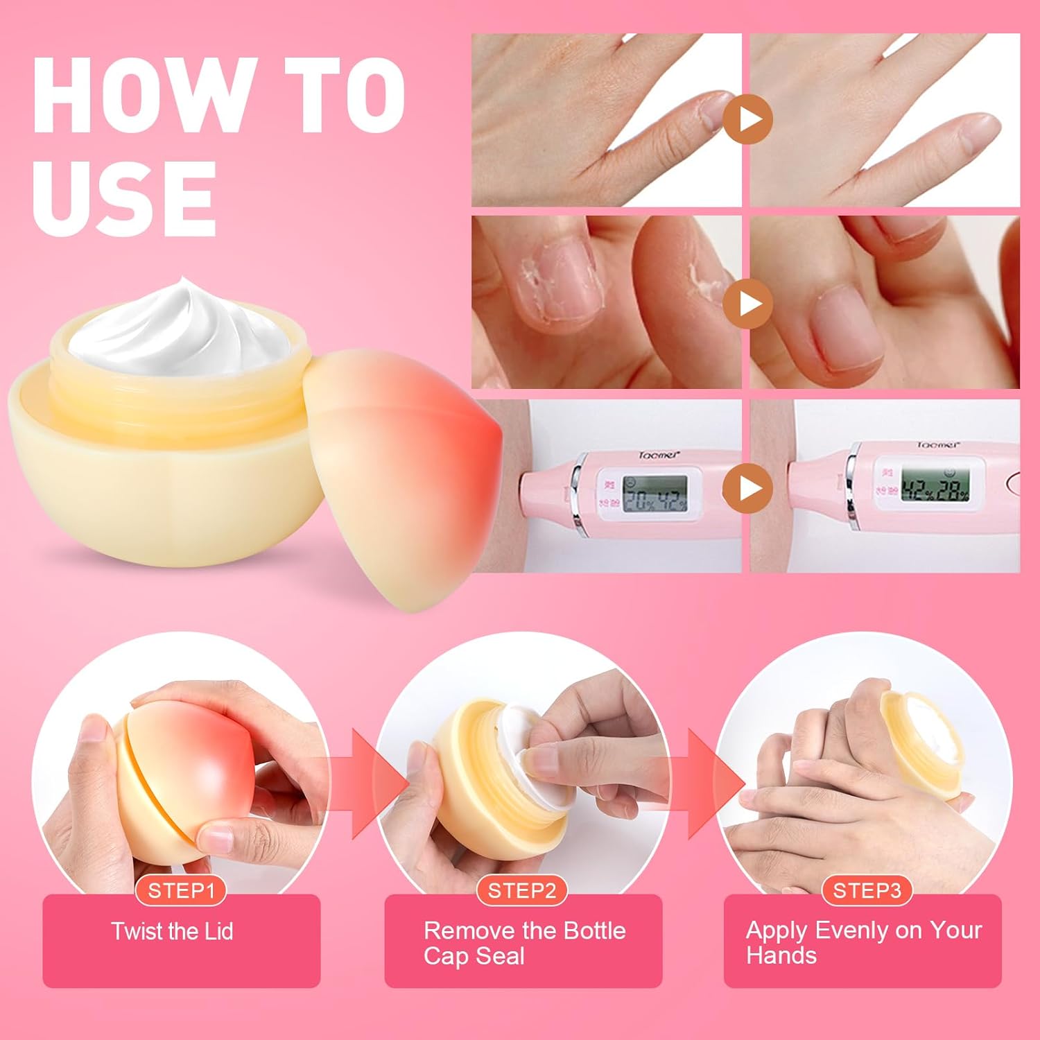 - 【Moisturizing and Hydrating】Hand cream is rich in essence,Vitamin E,coconut oil and shea butter,fast-absorbing,non-greasy,pleasant peach fragrance,hand cream is very effective for dry cracked hands,regularly applying these hand cream can keep smooth and hydrated