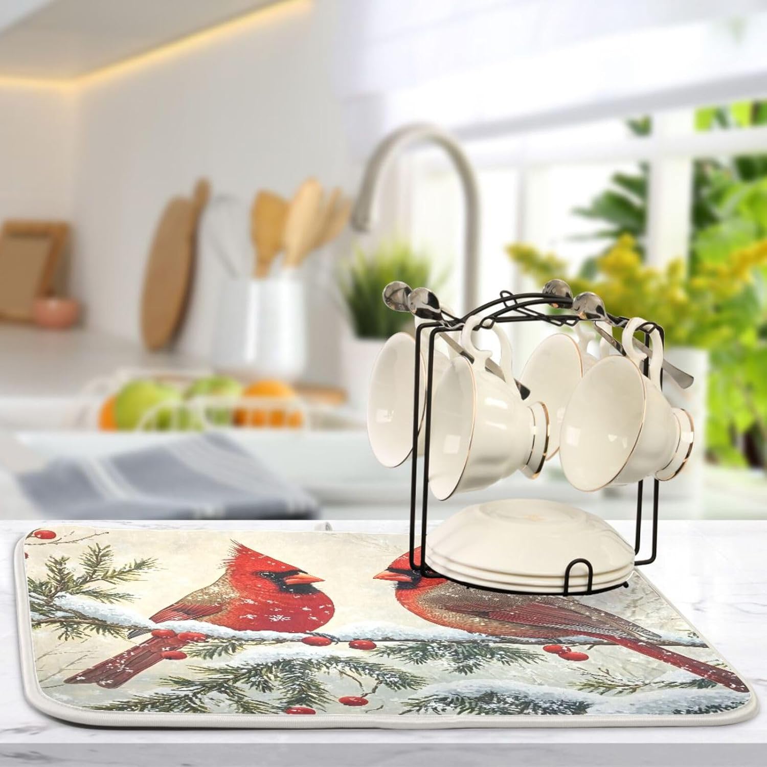 Christmas Dish Drying Mat Red Cardinals Birds Snowflake Branches Berries Winter Christmas Dish Drainer Mat for Kitchen Counter 18x24 inch Drying Mat Absorbent Microfiber Dish Mat