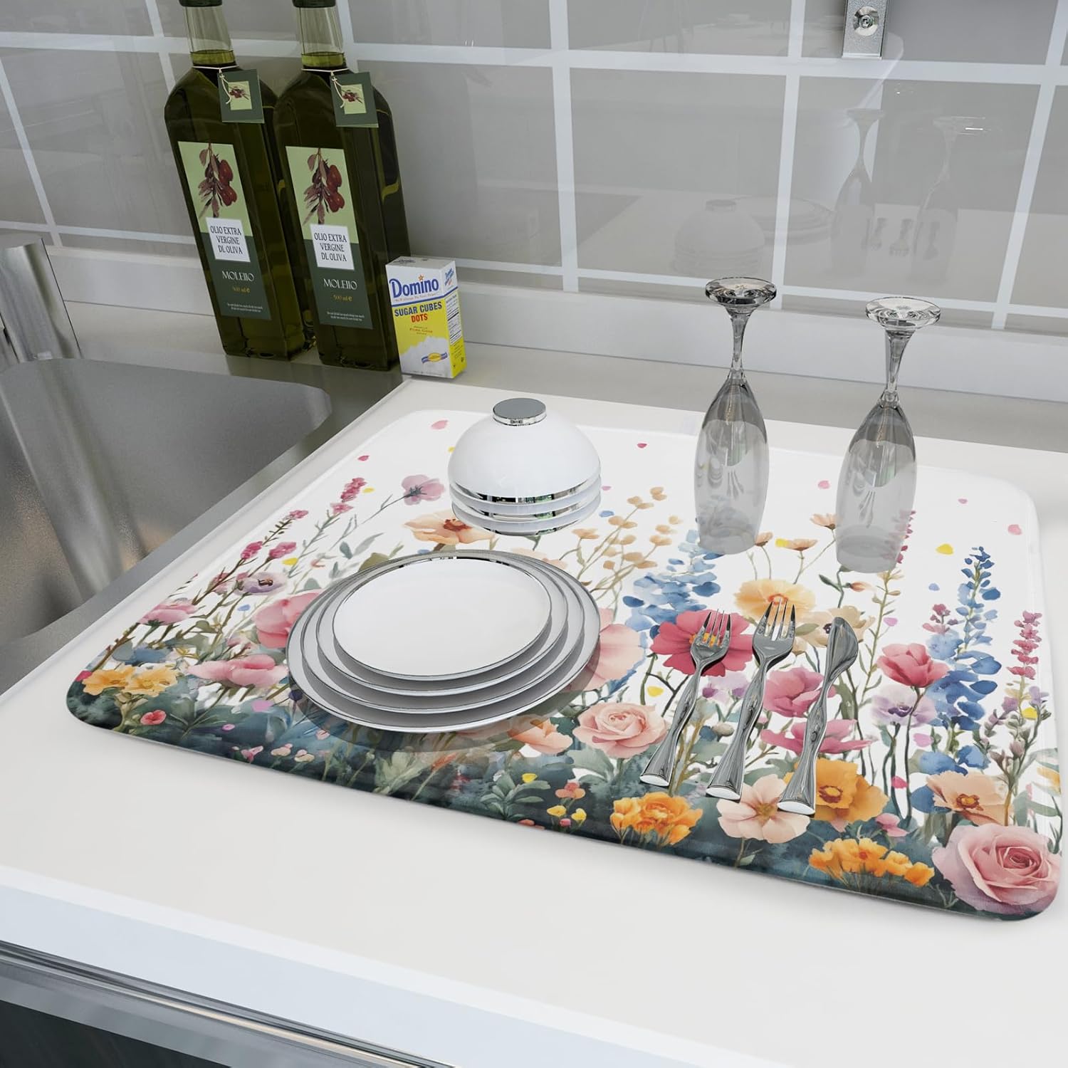 Colorful Flower Dish Drying Mat 18x24 Inch Botanical Floral Drainer Rack Mats Washable Absorbent Dish Dry Pad for Kitchen Counter Sink