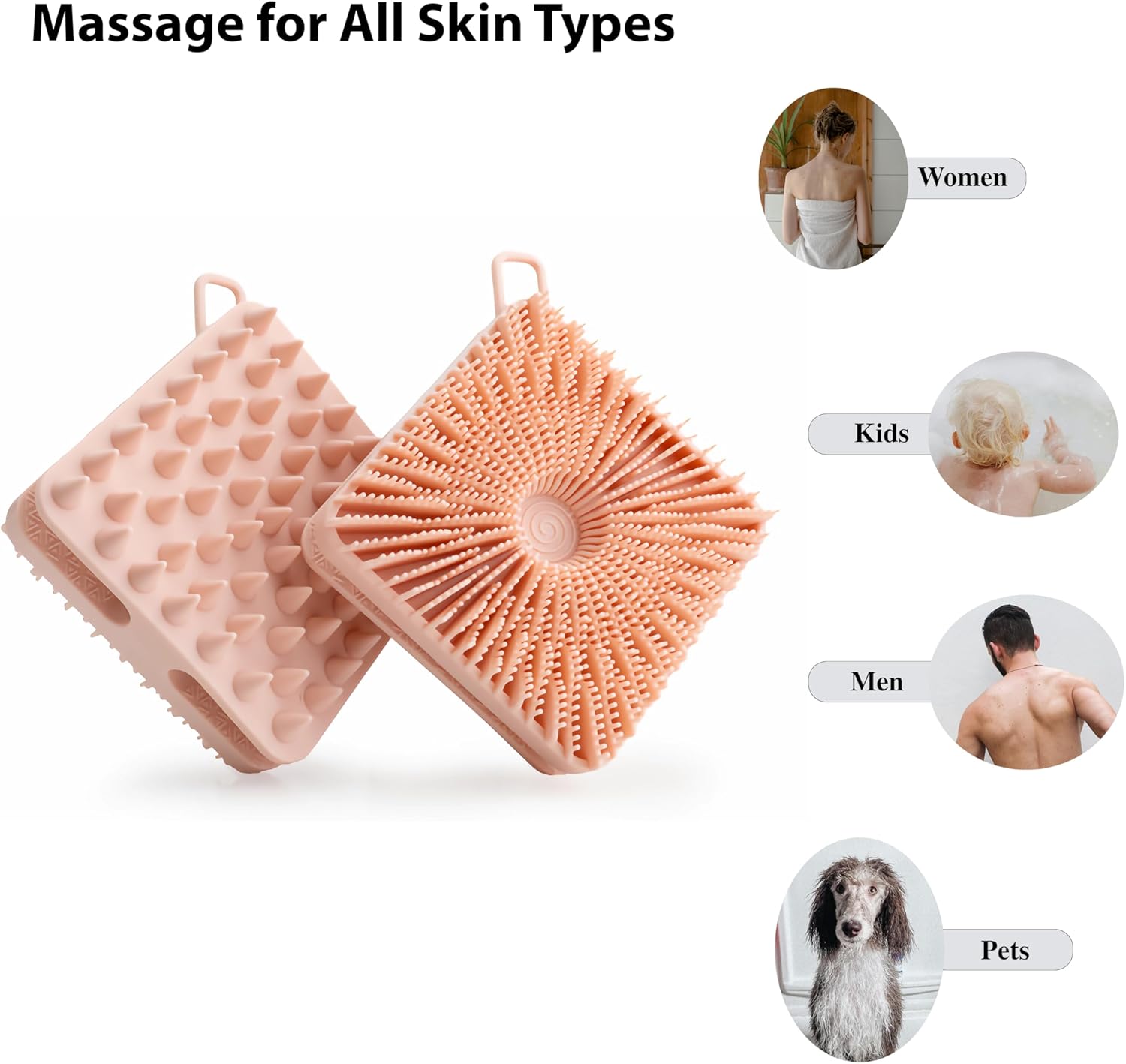 - Bath&Shower Brush with Better Design: 2 pc silicone body shampoo brushes included. The new design is not only optimized for better grip experience but also adds a hanging hole to make it easier to hang dry. Every time you take a shower or wash your hair using this silicone brush, you will enjoy a relaxing massage and feel refreshed.