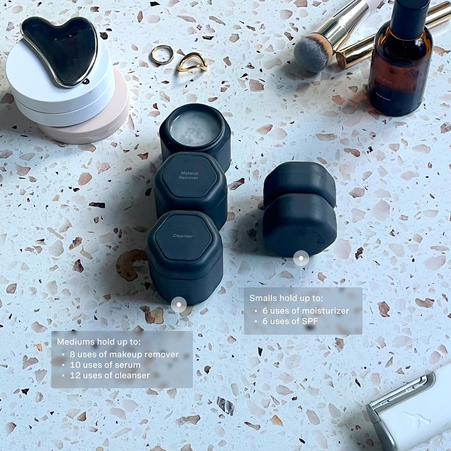 Cadence Travel Containers - Core Skincare Set - Magnetic Containers with Lids,2 Small (0.56oz) & 3 Medium (1.32oz) - Cleanser, Moisturizer, Serum, Makeup Remover & Sun Icon Labels - Charcoal