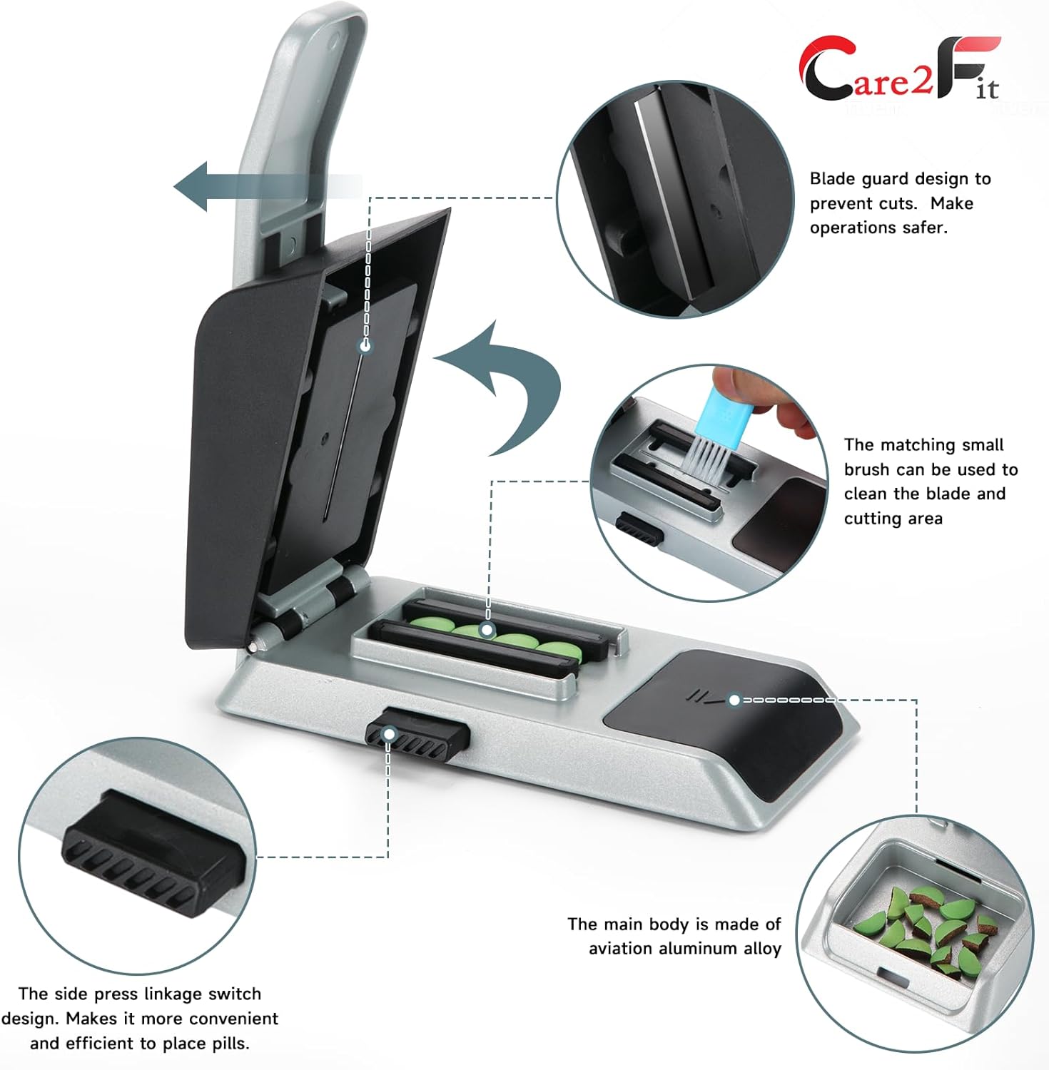 - 【Multiple sizes pill cutter】The Care2fit pill cutter linkage device can quickly center,accuracy split multiple pills at once.Our Care2fit pill cutter can safely accommodate pills of any size, round, rectangular or oval. This pill cutter splitter for small and tiny pills can cut pills with a width of 2mm-15mm, so it can easily cut tiny pills of 2.5mg.