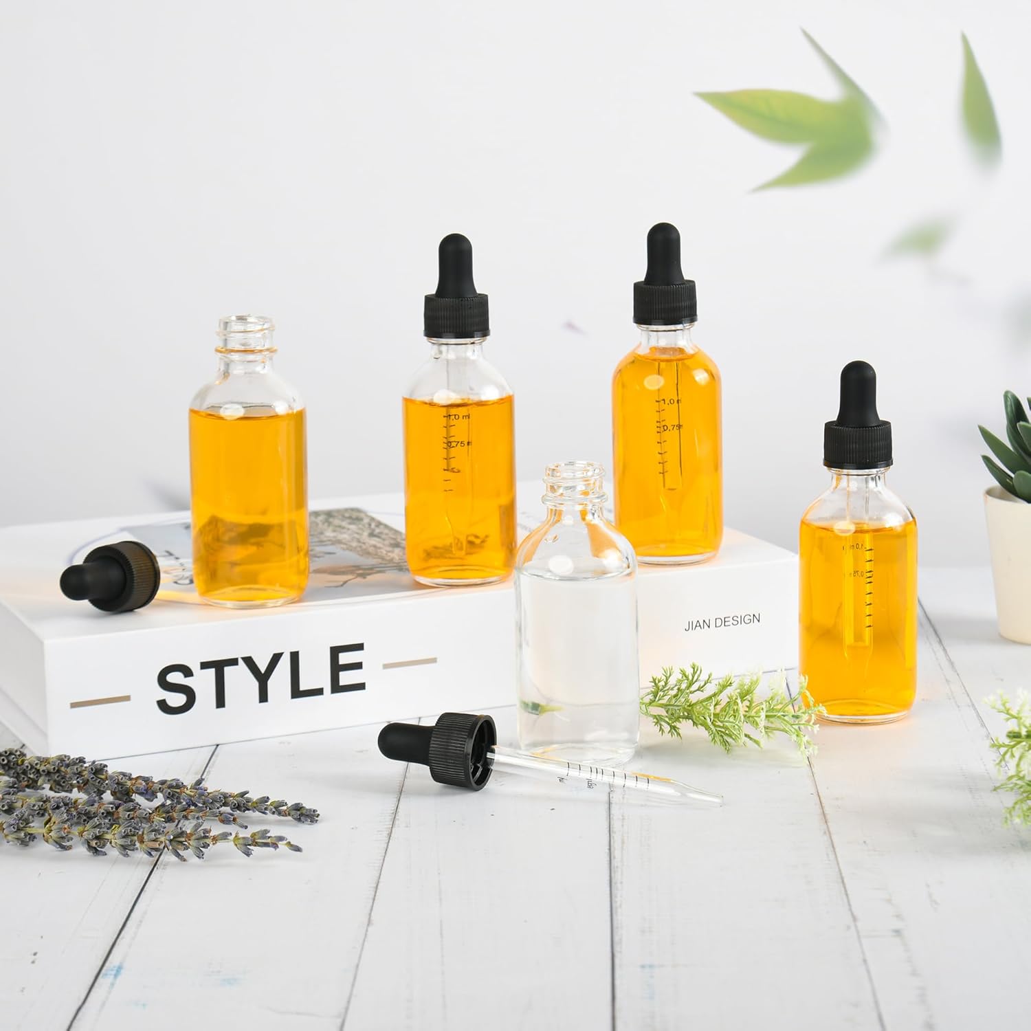 BILLIONSTARS 24 Pack 2oz Glass Boston Round Bottle with Graduated Calibrated Glass Pipettes - Clear - Tincture Bottles for Essential Oils, Liquids - Leakproof Travel Bottles