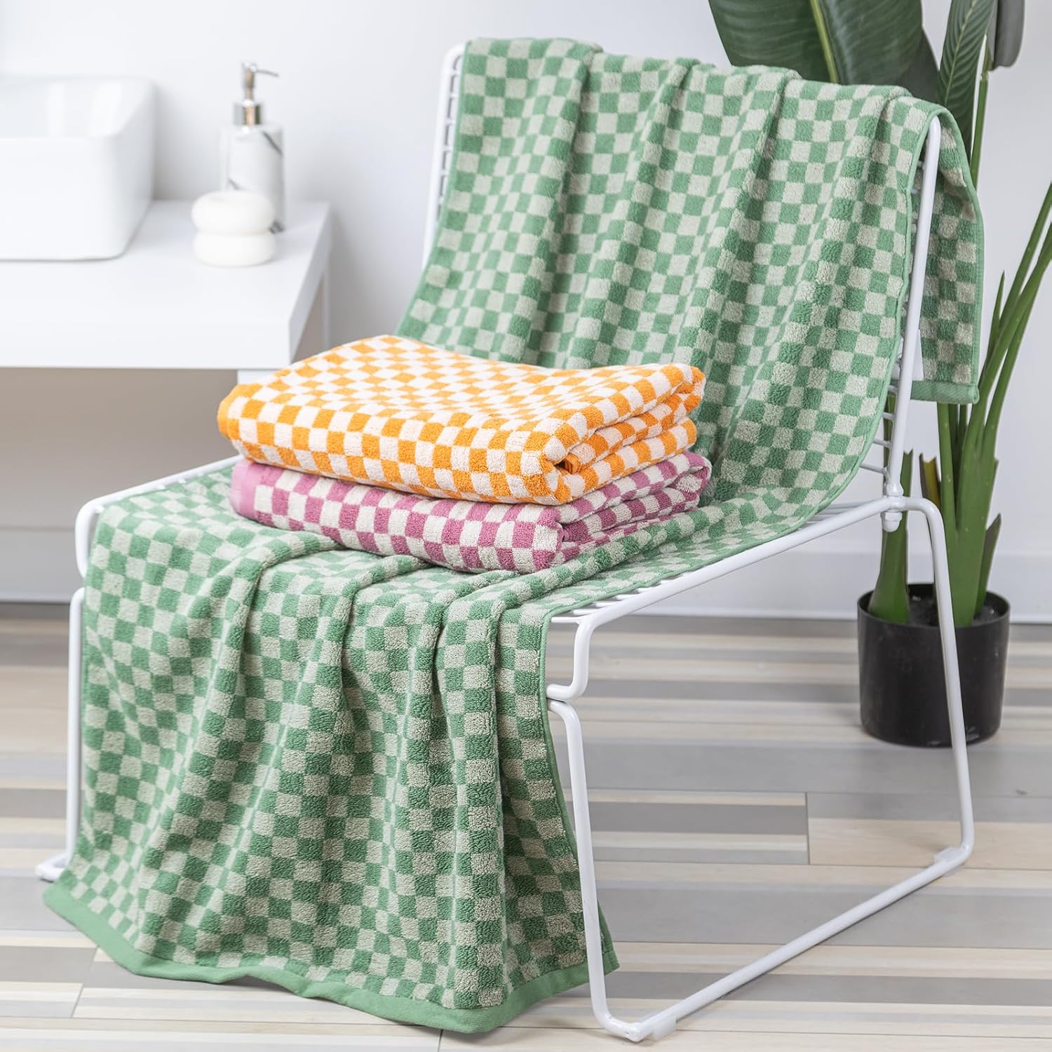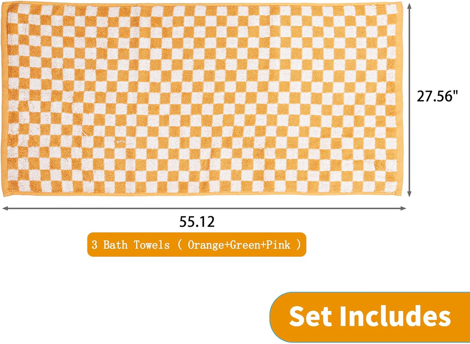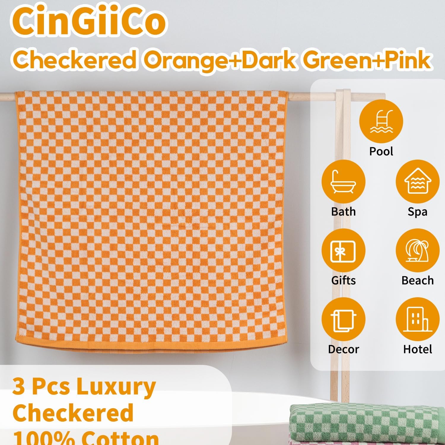 - CinGiiCo Bath Towel Set Includes: Checkered Cotton Bath Towels Large * 3 (55.12"*27.56"), Orange+Dark Green+Pink. Family sharing fun set for life's needs. Soft & Absorbent & Quick-dry bath towels set