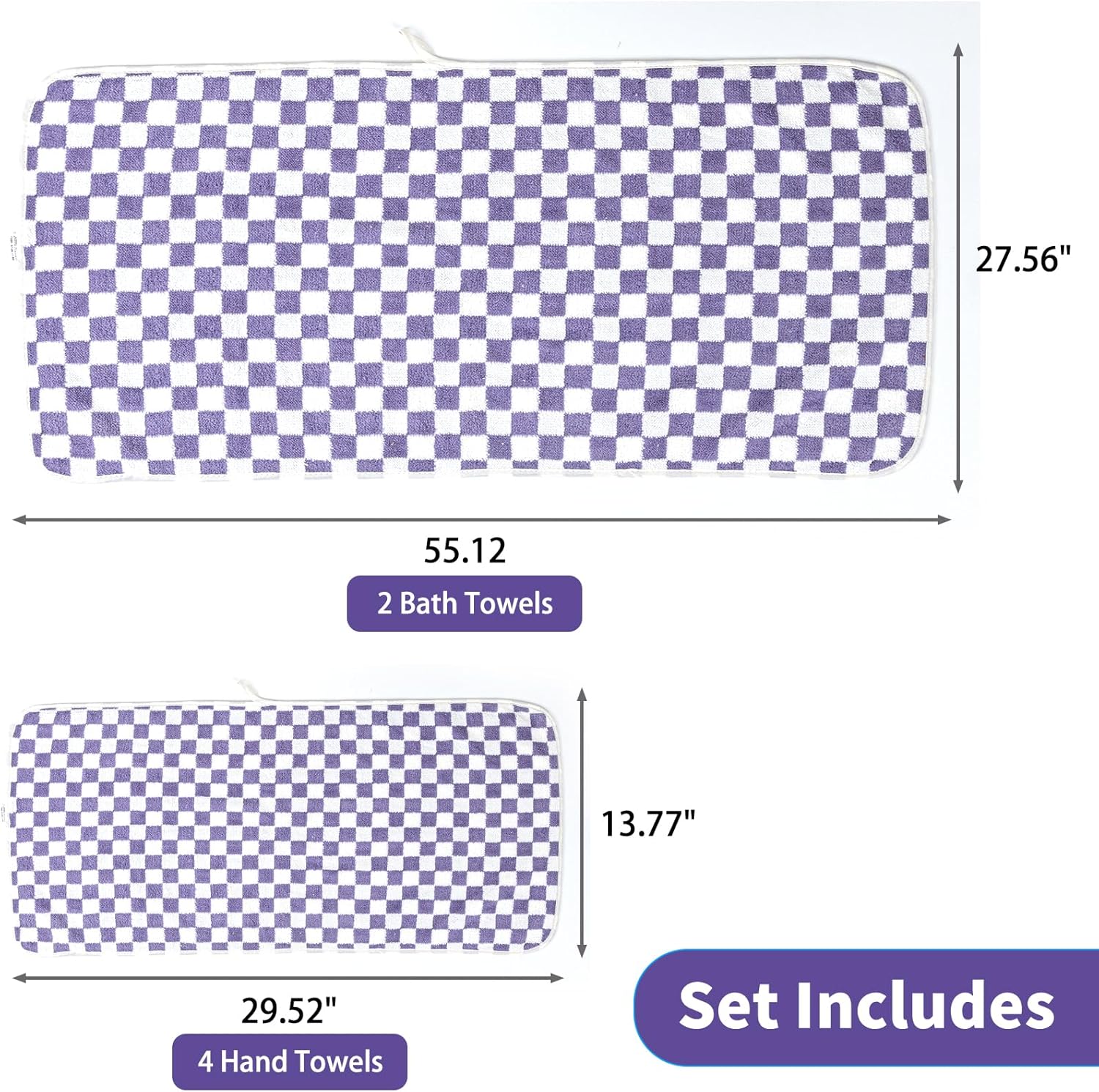 - CinGiiCo Bath Towel Set Includes: Checkered Bath Towels Large * 2 (55.12"*27.56"), Hand towels * 4 (29.52"*13.77"), Purple. Family sharing fun set for life's needs. Soft & Absorbent & Quick-dry