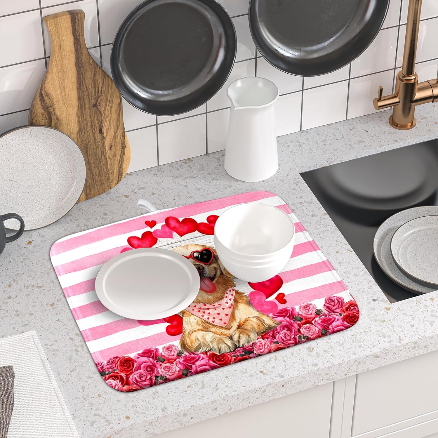 Valentine's Day Dog Dish Drying Mat for Kitchen Counter 16x18 inch Heart Rose Absorbent Dish Drainer Rack Mats for Coffee Bar Countertop