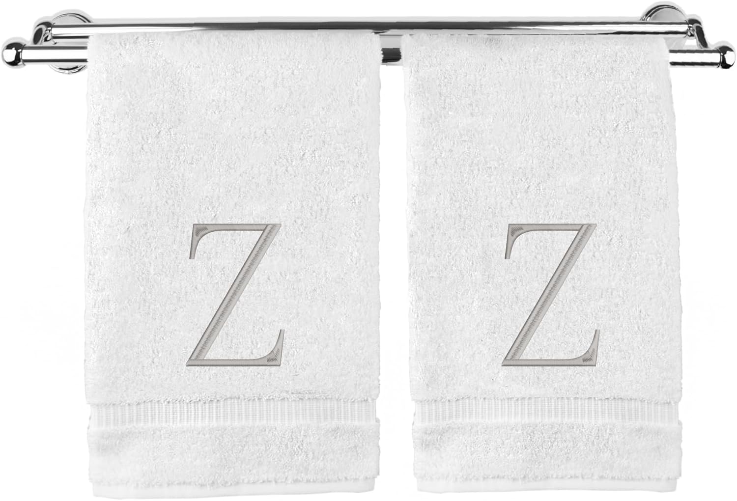 Monogrammed Hand Towel, Personalized Initial Gift, Extra Absorbent 100% Turkish Cotton - Soft Terry Finish - Set of 2 - Silver Block Initial Z - Embroidered on White Towels