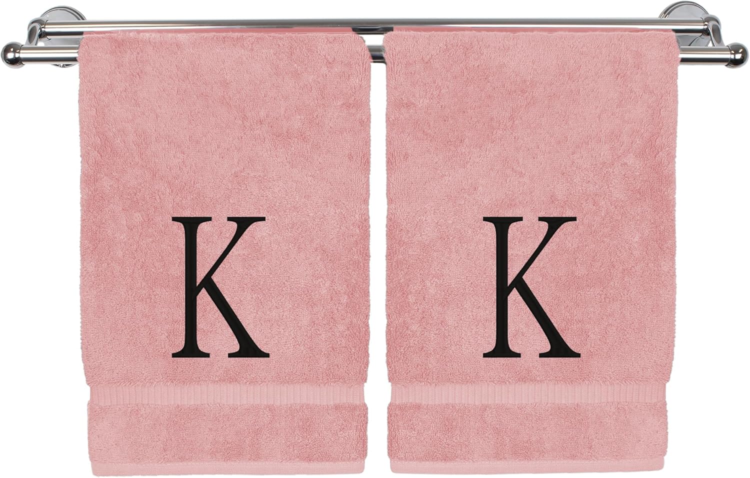 Monogrammed Hand Towel, Personalized Initial Gift, Extra Absorbent 100% Turkish Cotton - Soft Terry Finish - Set of 2 - Black Block Initial K - Embroidered on Pink Towels