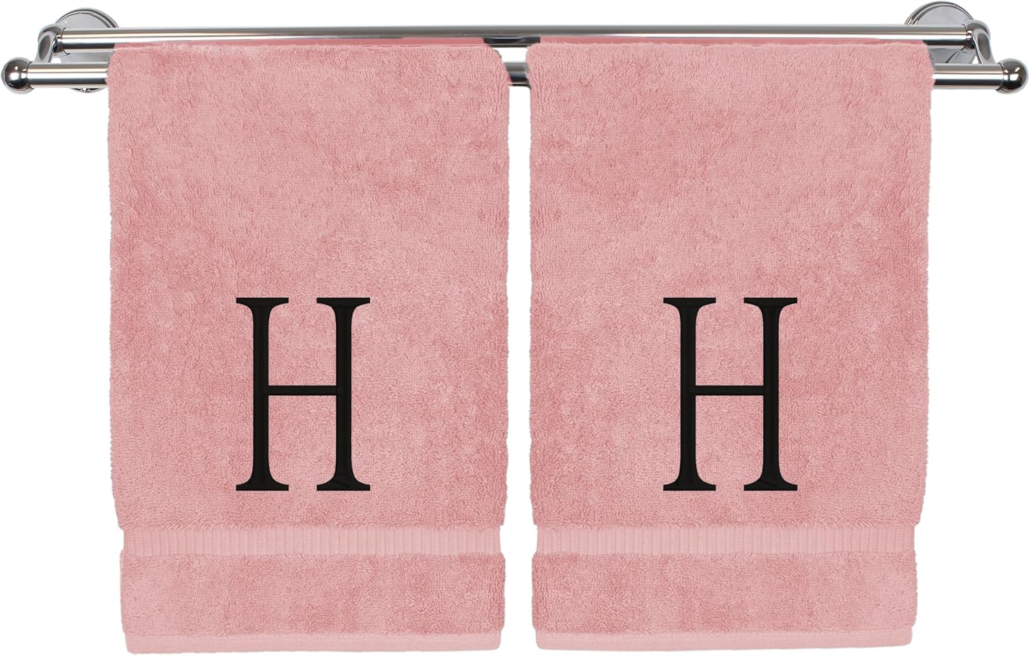 Monogrammed Hand Towel, Personalized Initial Gift, Extra Absorbent 100% Turkish Cotton - Soft Terry Finish - Set of 2 - Black Block Initial H - Embroidered on Pink Towels