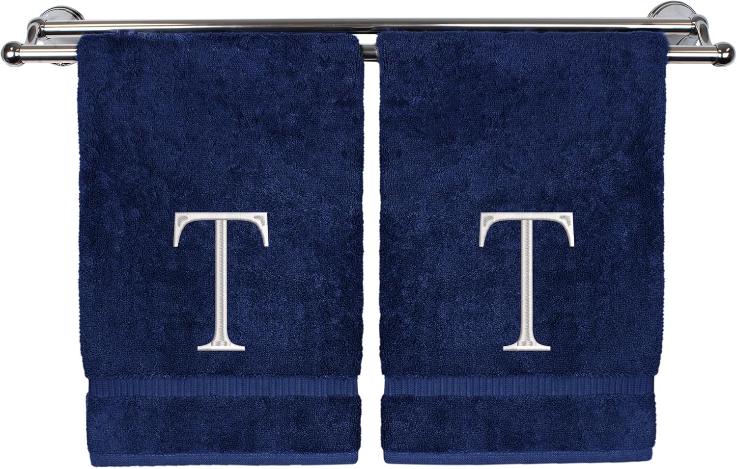 Monogrammed Hand Towel, Personalized Initial Gift, Extra Absorbent 100% Turkish Cotton - Soft Terry Finish - Set of 2 - White Block Initial T - Embroidered on Navy Blue Towels