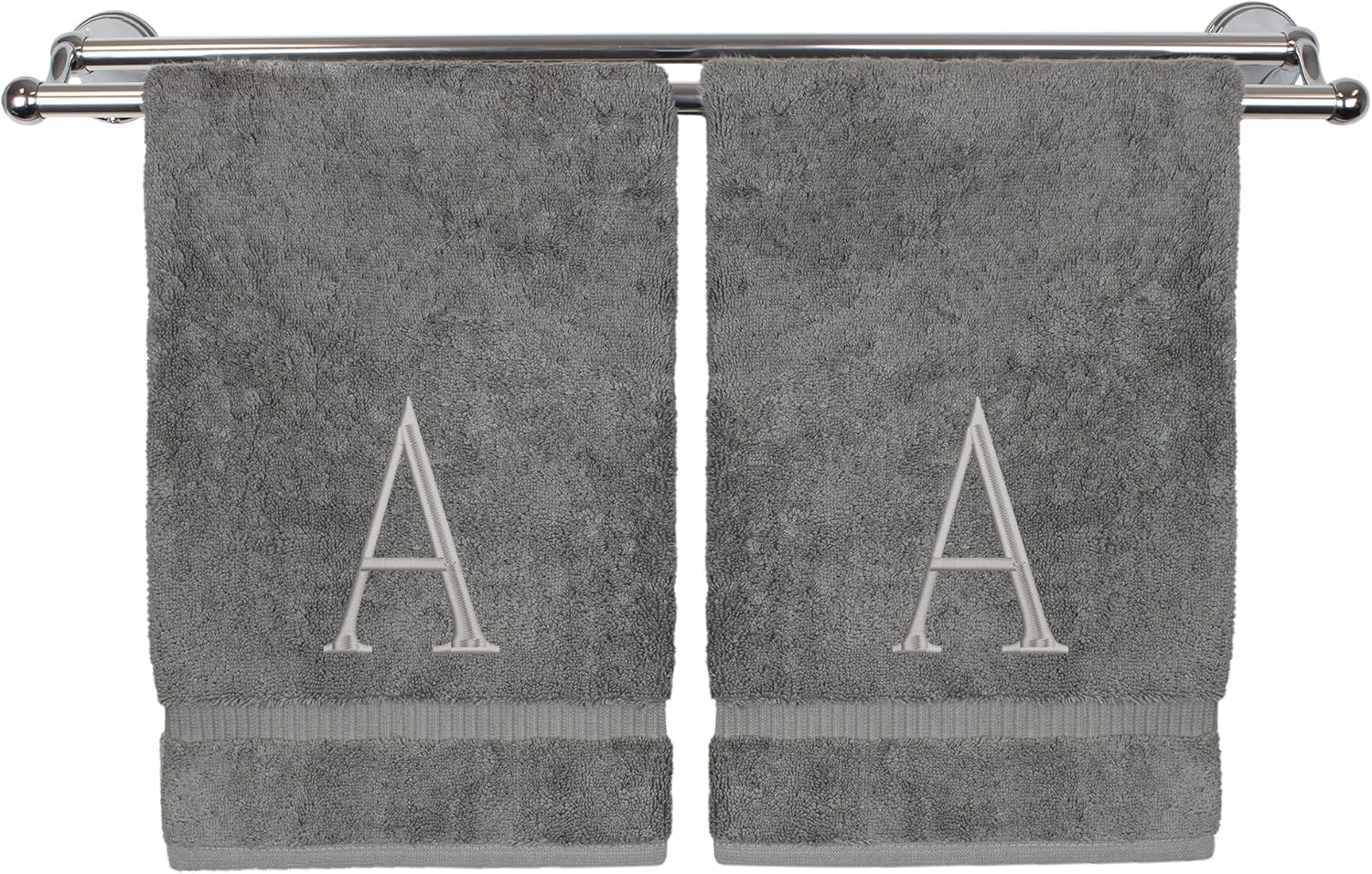 Monogrammed Hand Towel, Personalized Initial Gift, Extra Absorbent 100% Turkish Cotton - Soft Terry Finish - Set of 2 - Silver Block Initial A - Embroidered on Grey Towels