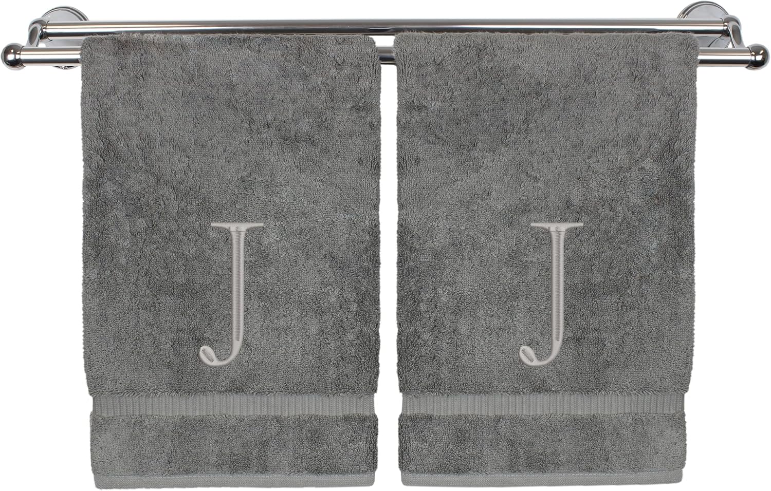 Monogrammed Hand Towel, Personalized Initial Gift, Extra Absorbent 100% Turkish Cotton - Soft Terry Finish - Set of 2 - Silver Block Initial J - Embroidered on Grey Towels