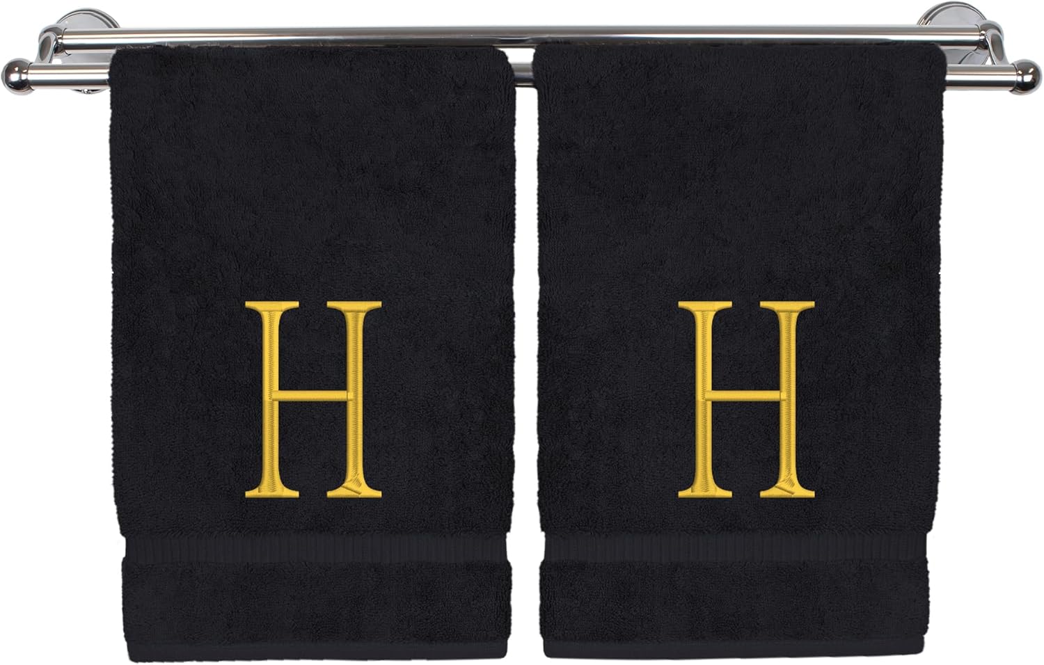 Monogrammed Hand Towel, Personalized Initial Gift, Extra Absorbent 100% Turkish Cotton - Soft Terry Finish - Set of 2 - Gold Block Initial H - Embroidered on Black Towels