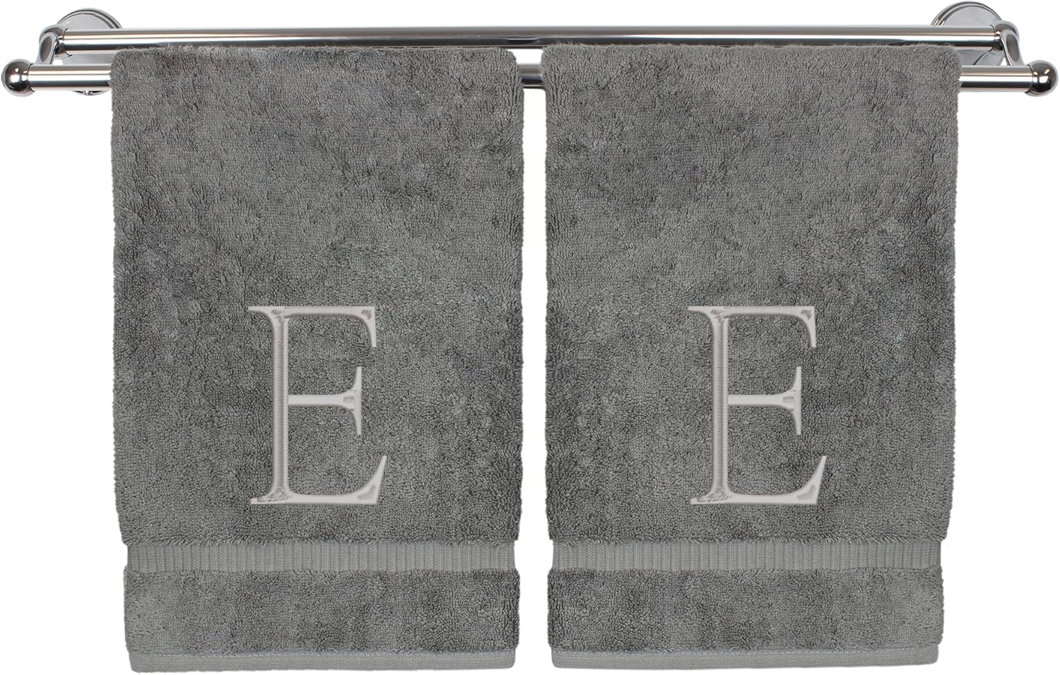 Monogrammed Hand Towel, Personalized Initial Gift, Extra Absorbent 100% Turkish Cotton - Soft Terry Finish - Set of 2 - Silver Block Initial E - Embroidered on Grey Towels