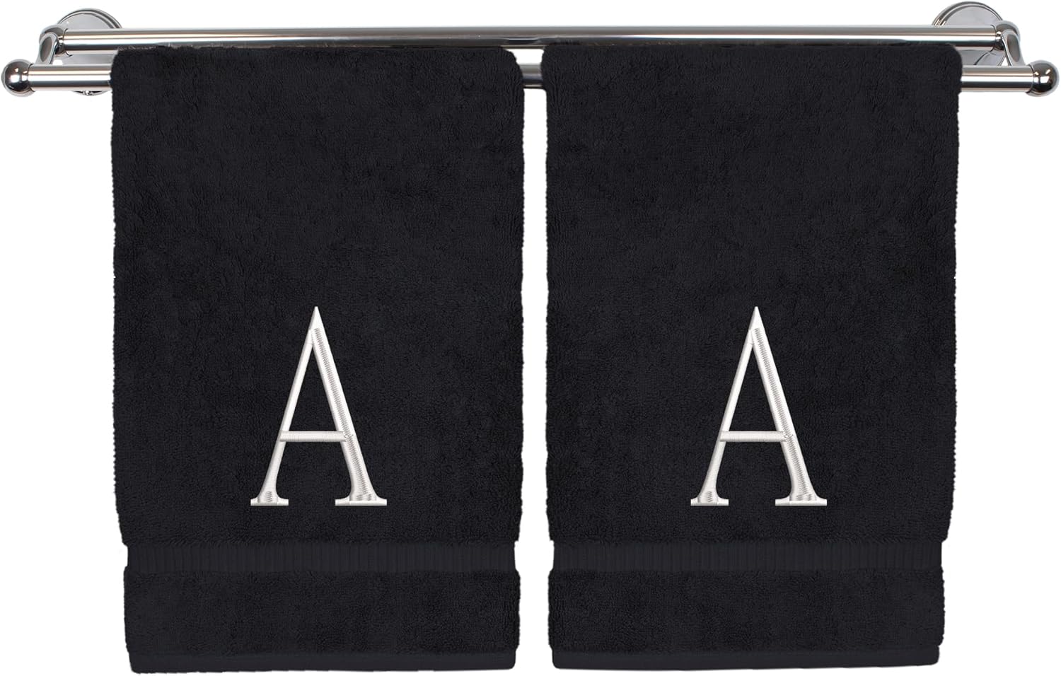 Monogrammed Hand Towel, Personalized Initial Gift, Extra Absorbent 100% Turkish Cotton - Soft Terry Finish - Set of 2 - White Block Initial A - Embroidered on Black Towels