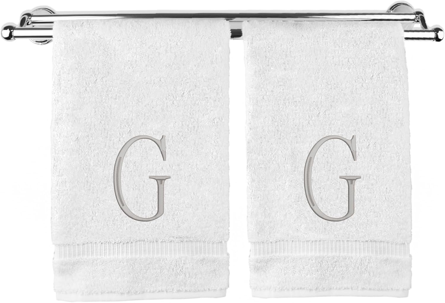 Monogrammed Hand Towel, Personalized Initial Gift, Extra Absorbent 100% Turkish Cotton - Soft Terry Finish - Set of 2 - Silver Block Initial G - Embroidered on White Towels
