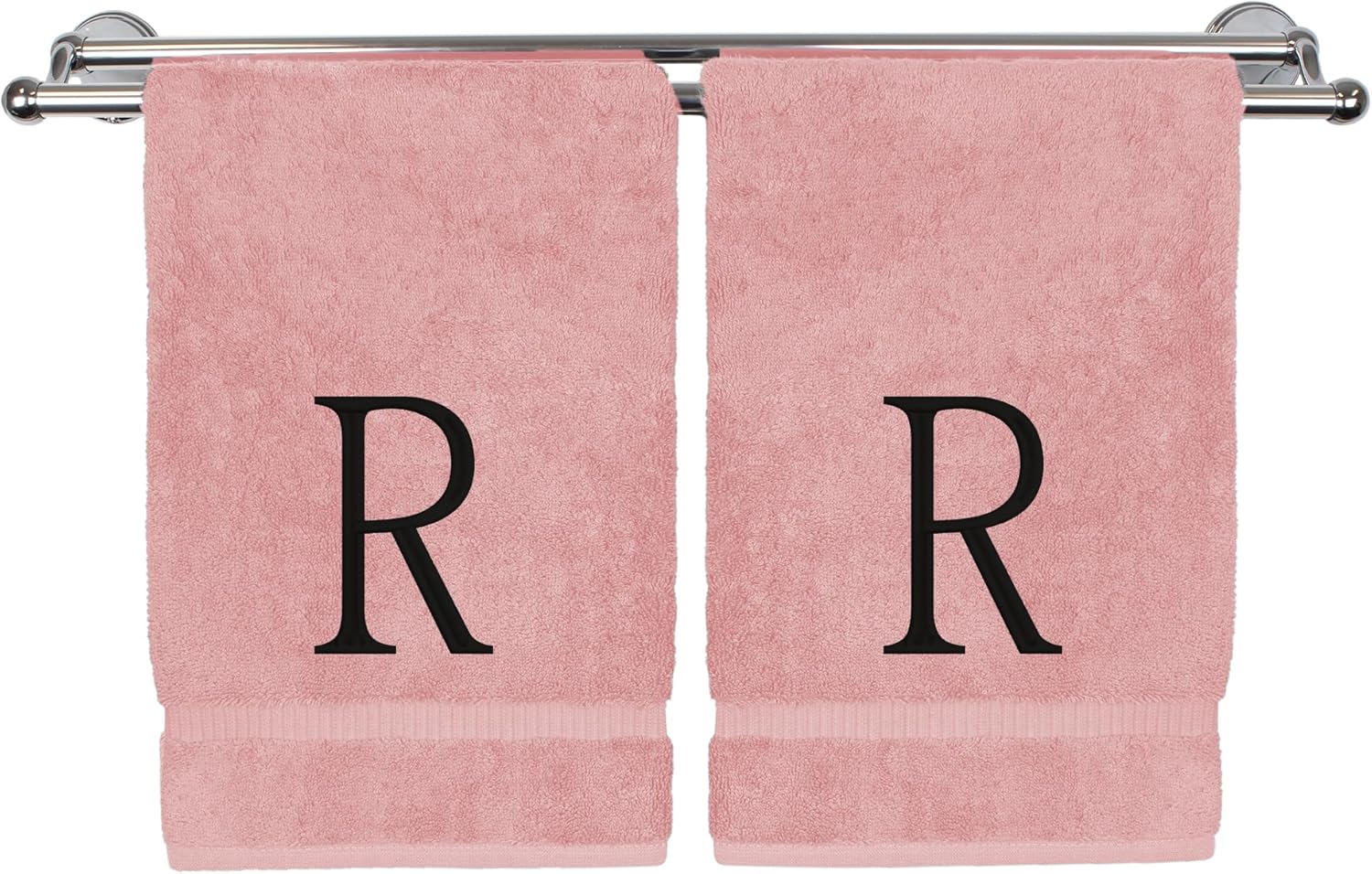 Monogrammed Hand Towel, Personalized Initial Gift, Extra Absorbent 100% Turkish Cotton - Soft Terry Finish - Set of 2 - Black Block Initial R - Embroidered on Pink Towels