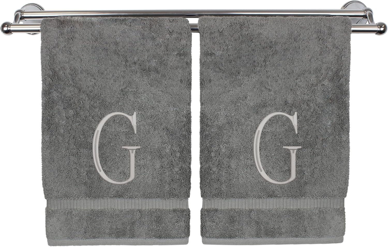 Monogrammed Hand Towel, Personalized Initial Gift, Extra Absorbent 100% Turkish Cotton - Soft Terry Finish - Set of 2 - Silver Block Initial G - Embroidered on Grey Towels