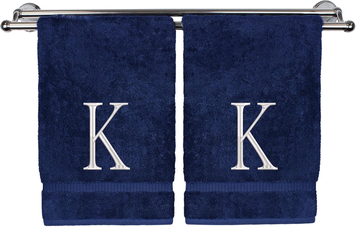 Monogrammed Hand Towel, Personalized Initial Gift, Extra Absorbent 100% Turkish Cotton - Soft Terry Finish - Set of 2 - White Block Initial K - Embroidered on Navy Blue Towels