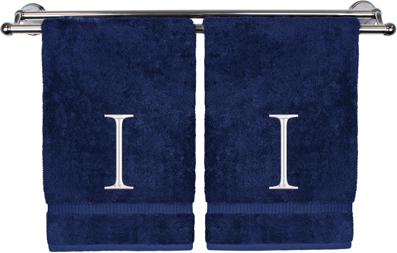 Monogrammed Hand Towel, Personalized Initial Gift, Extra Absorbent 100% Turkish Cotton - Soft Terry Finish - Set of 2 - White Block Initial I - Embroidered on Navy Blue Towels