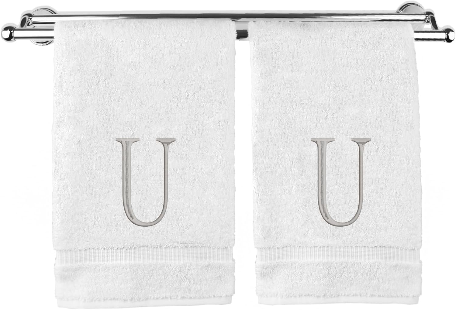 Monogrammed Hand Towel, Personalized Initial Gift, Extra Absorbent 100% Turkish Cotton - Soft Terry Finish - Set of 2 - Silver Block Initial U - Embroidered on White Towels