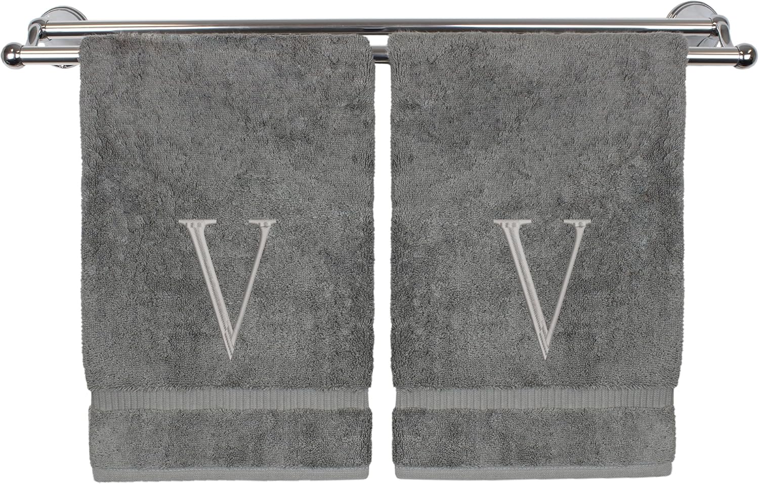Monogrammed Hand Towel, Personalized Initial Gift, Extra Absorbent 100% Turkish Cotton - Soft Terry Finish - Set of 2 - Silver Block Initial V - Embroidered on Grey Towels