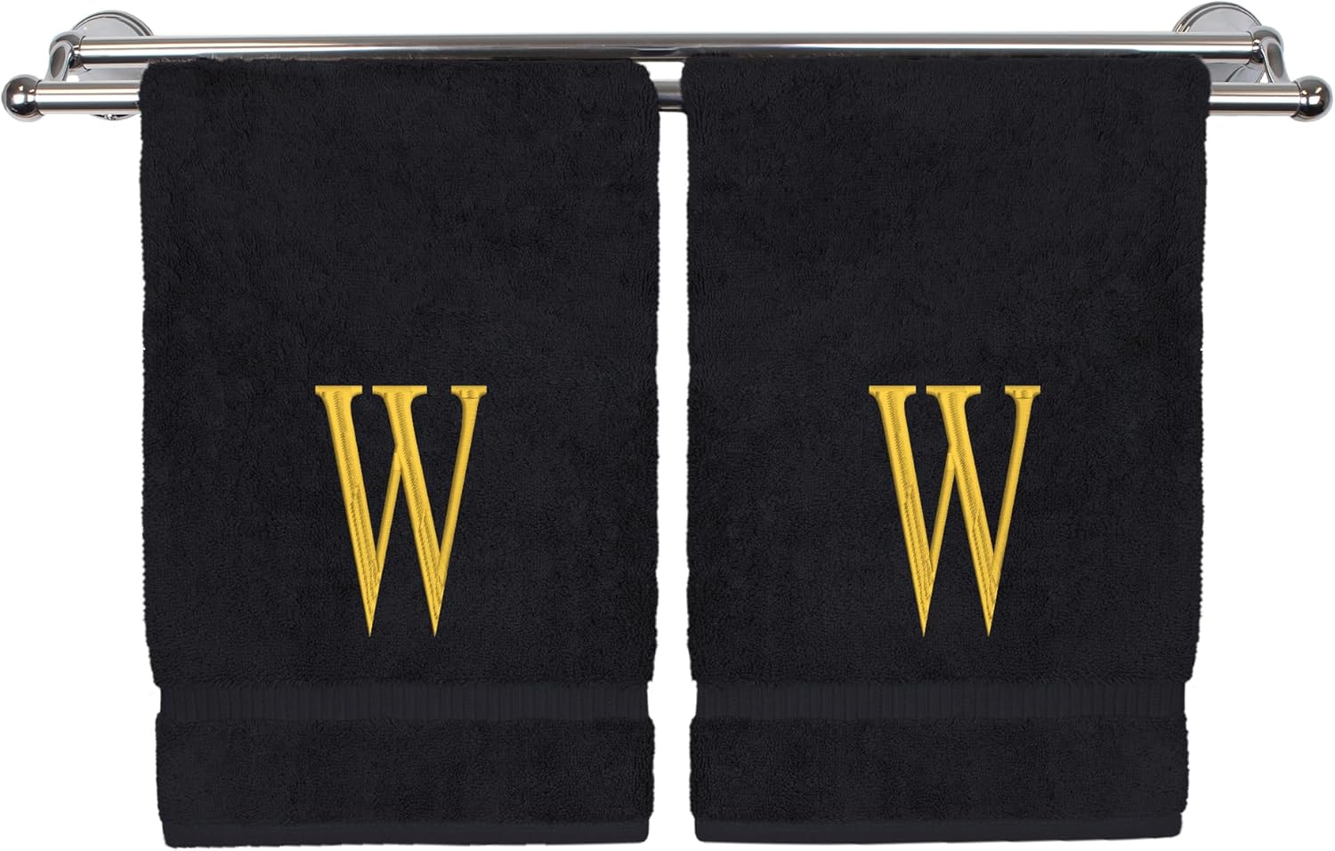 Monogrammed Hand Towel, Personalized Initial Gift, Extra Absorbent 100% Turkish Cotton - Soft Terry Finish - Set of 2 - Gold Block Initial W - Embroidered on Black Towels
