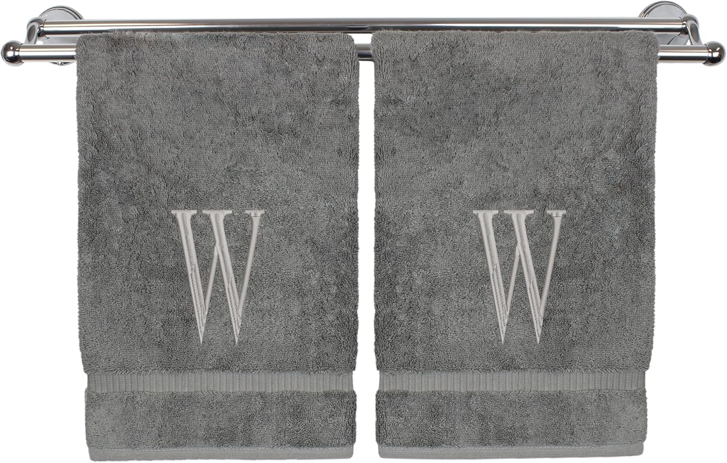 Monogrammed Hand Towel, Personalized Initial Gift, Extra Absorbent 100% Turkish Cotton - Soft Terry Finish - Set of 2 - Silver Block Initial W - Embroidered on Grey Towels